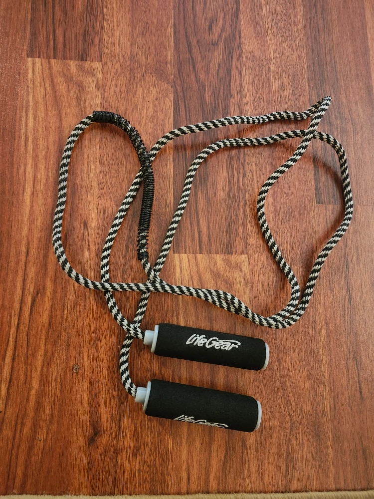 Black and white striped jump rope with black handles. The handles are wieghted.9 1/2 feet long