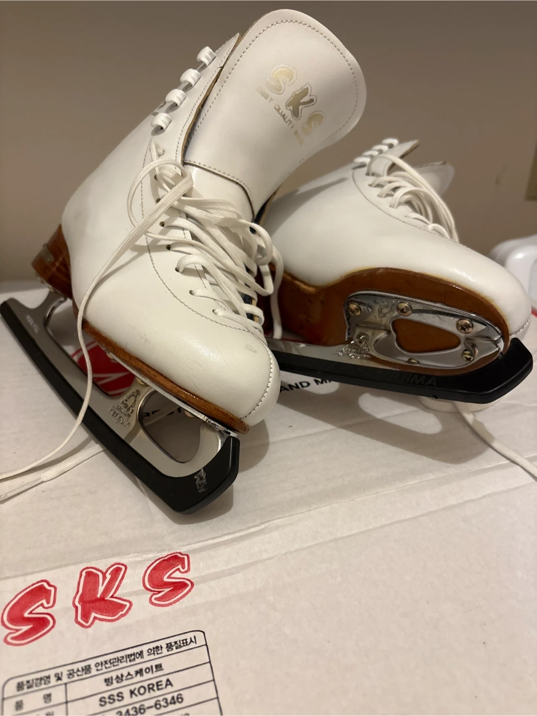 Selling a pair of SKS figure skates(asian size 210) They're white with a wood-look heel. The blades are marked 'Sprint-Steel'. They show some signs of wear on the blades, but overall they're in good condition for skating, coming with a box. Please check the photos for details!