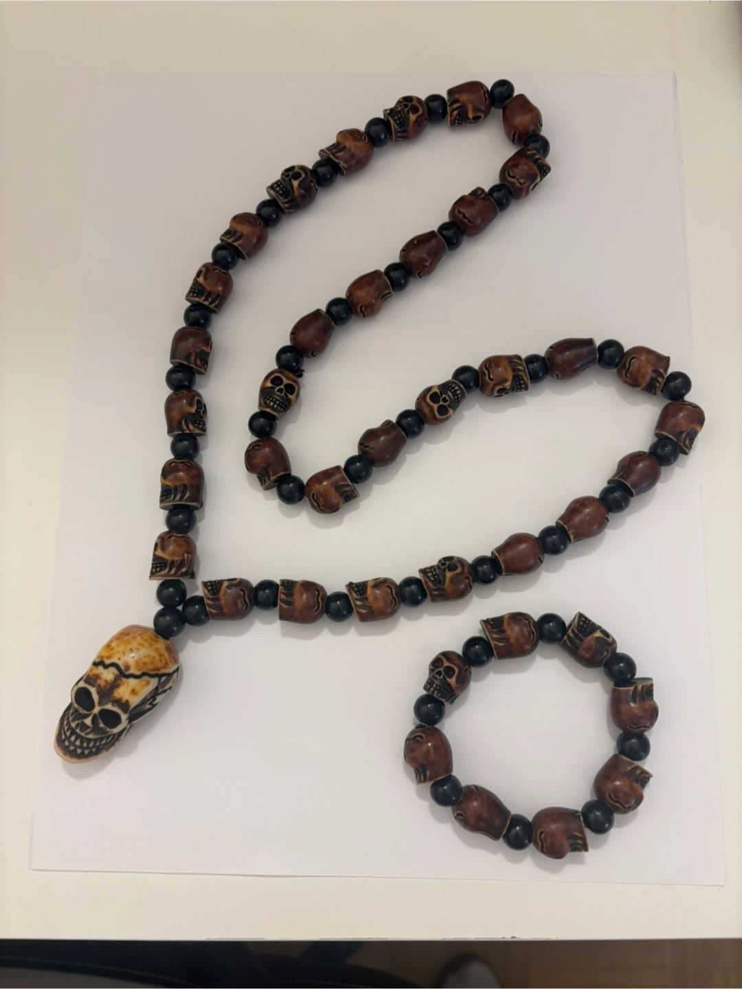 Cool skull bead necklace and bracelet set! The beads are brown with black accents, giving it a unique and edgy look. Perfect for adding some personality to your style
