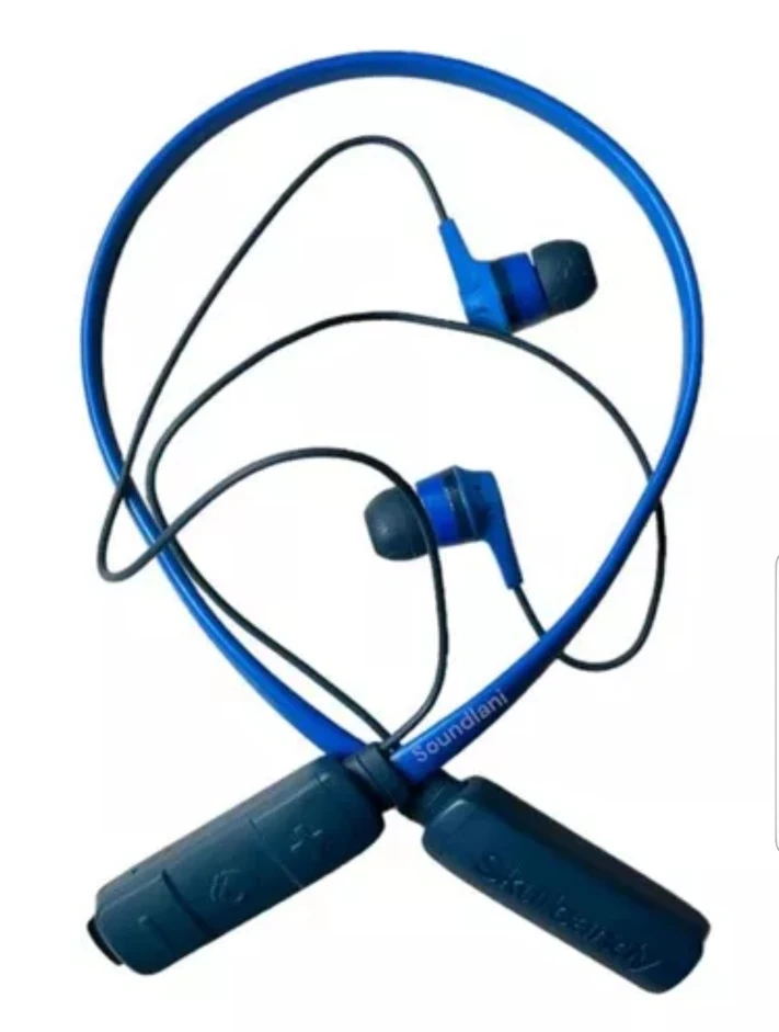 Wireless Bluetooth neckband earbuds. Blue colour. Good for working out. Lightweight and comfortable.