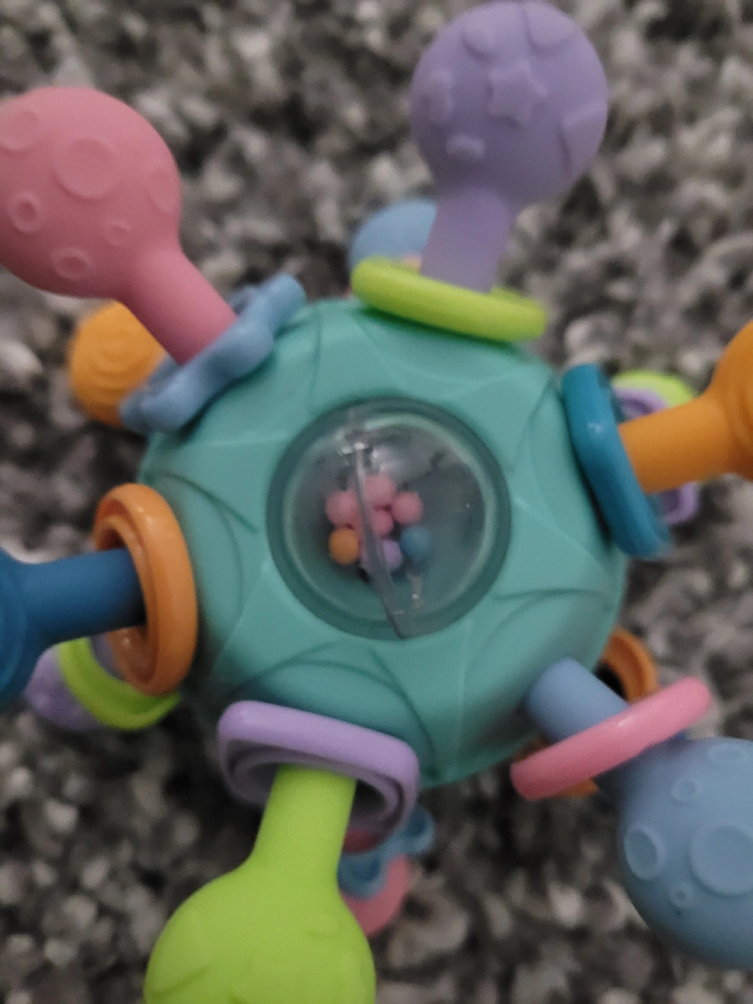 Looking to sell a Skwish Rattle and Teether toy! It's a grasping activity toy that's great for babies. It has colourful wooden dowels, beads that slide and rattle, and elastic ties. It's lightweight and easy for little hands to hold and explore!