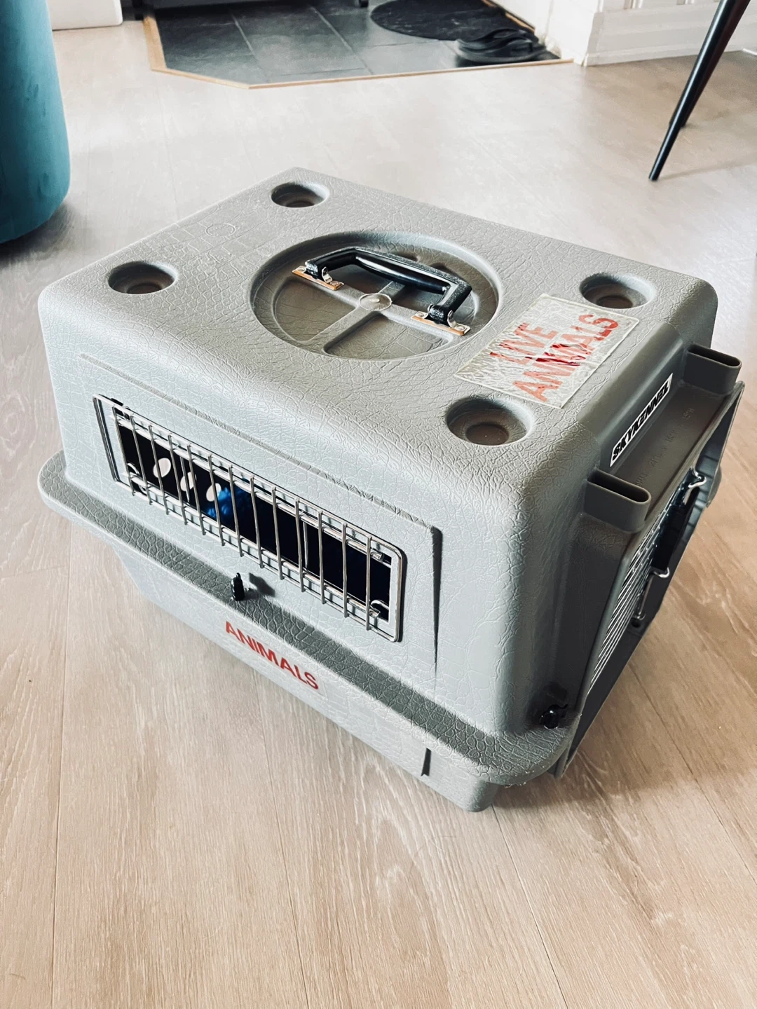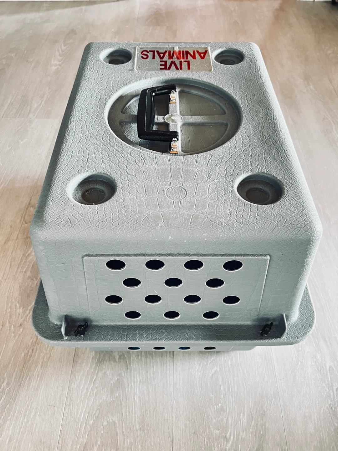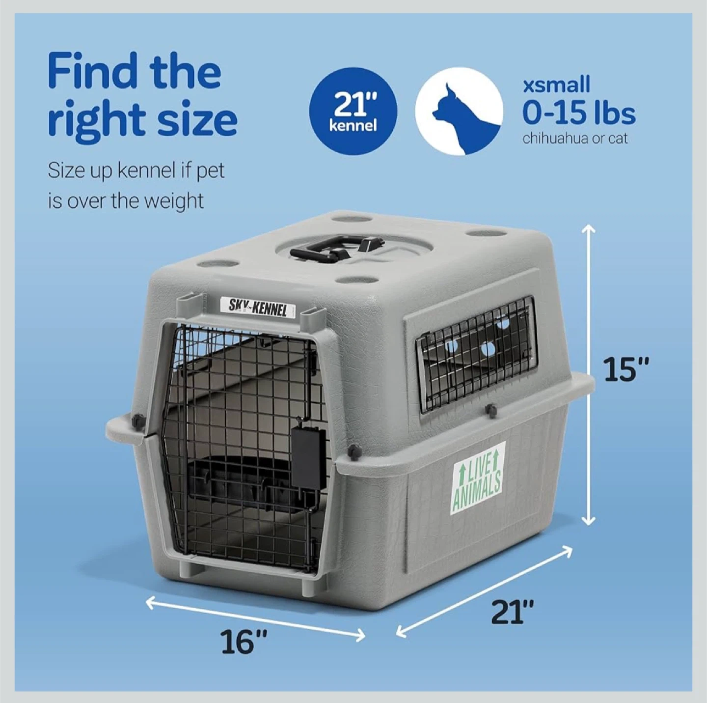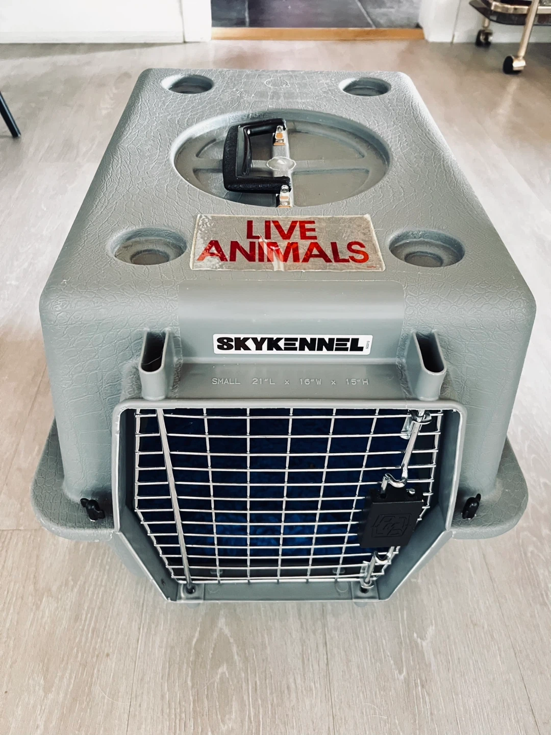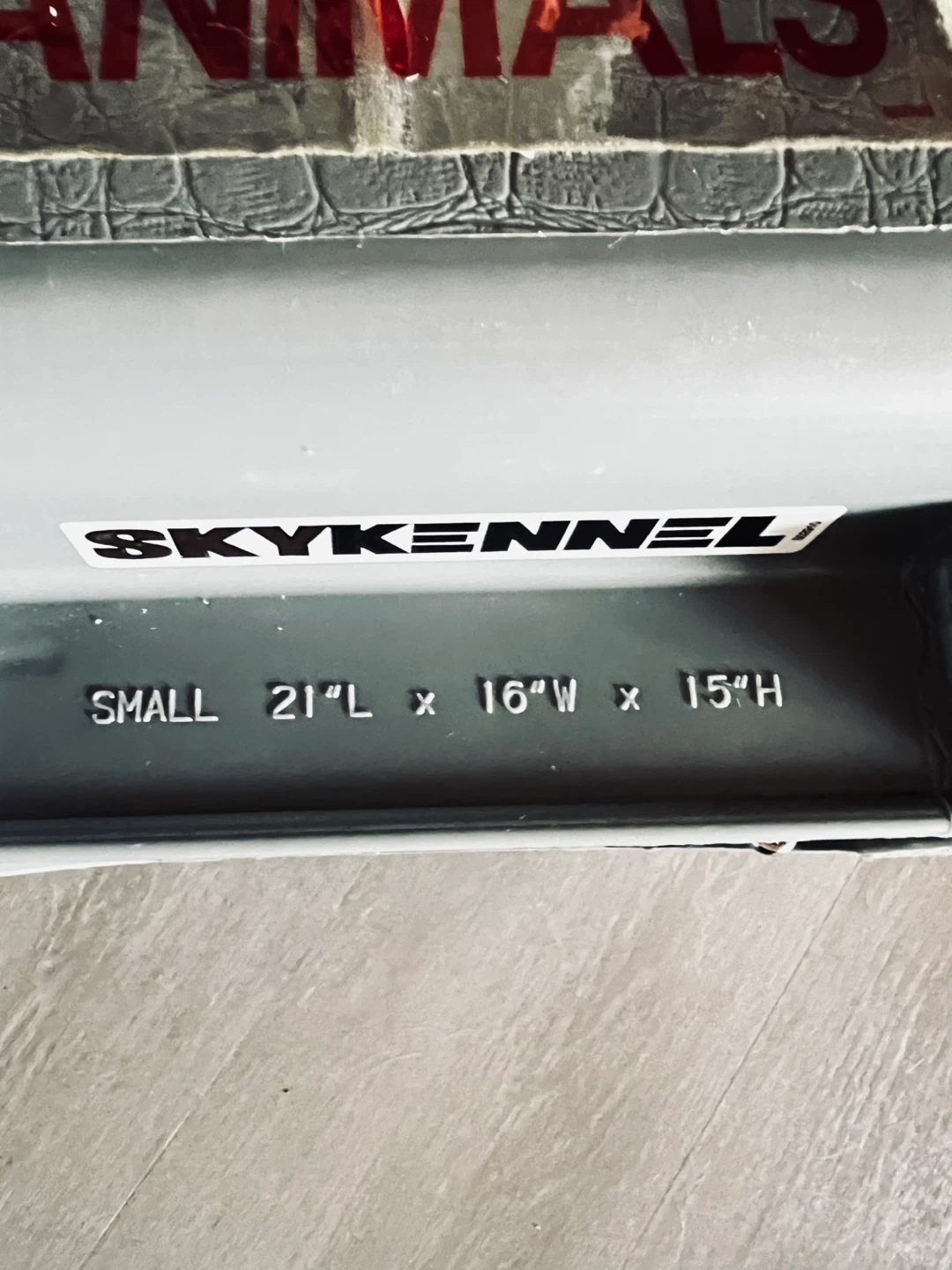 Selling a small Sky Kennel pet carrier. It's in great shape and ready for your furry friend! The dimensions are 21" L x 16" W x 15" H Used once. Comes with a microfibre absorption mat.