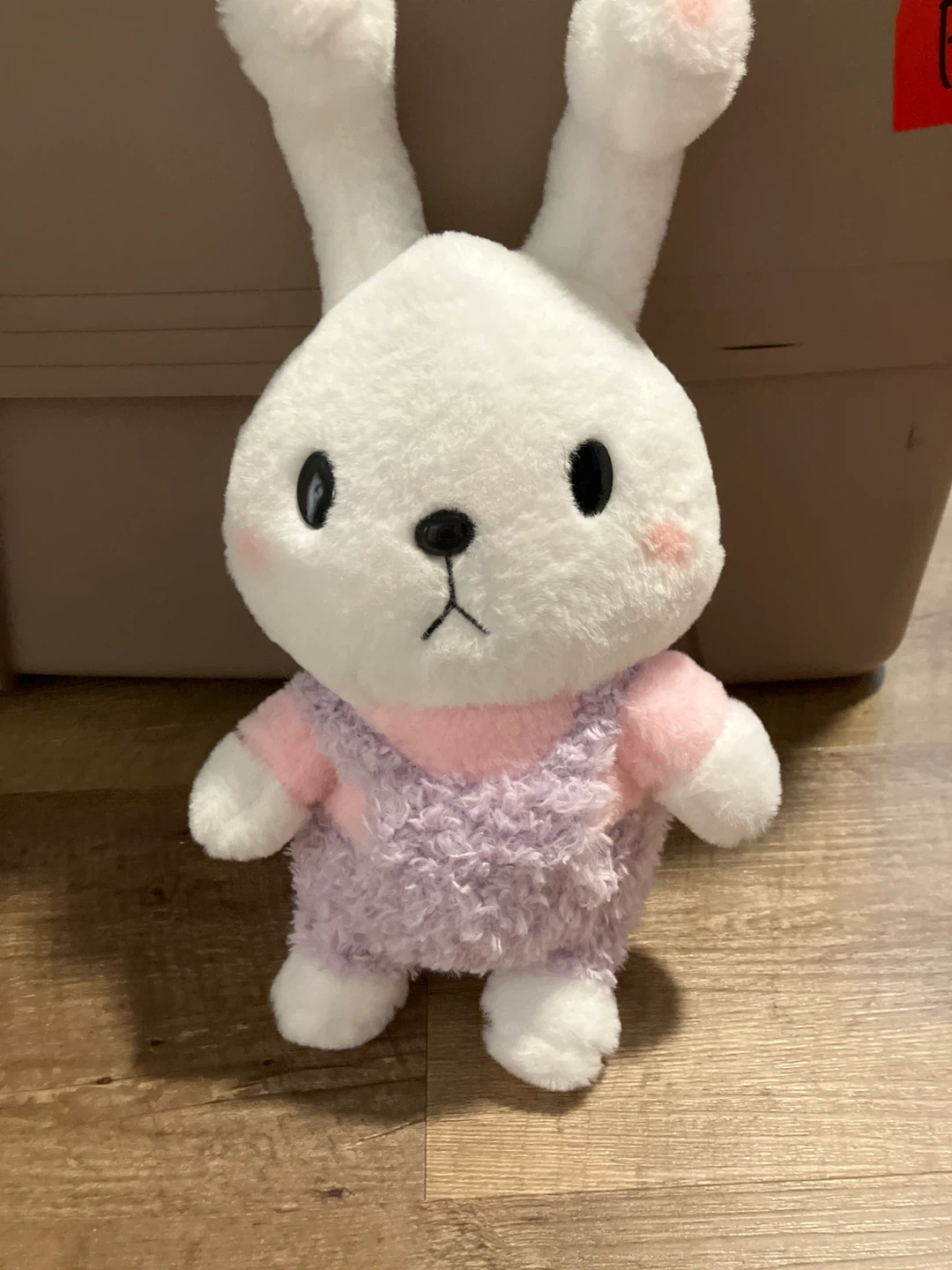 Selling a somewhat cursed looking white bunny plush! It's in great condition and ready for a new home. It's wearing a sweet pink and purple outfit. Perfect for a child's room to hide in their closet or under their bed to haunt their dreams and make sure they sleep π