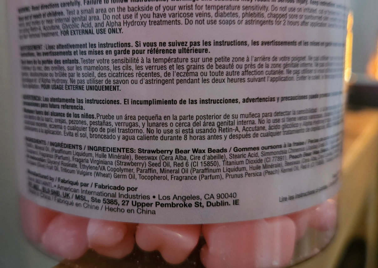 These are Sliick Strawberry + Peach Bear hard wax beads, perfect for face and body waxing! The container has 226g / Net Wt 8 oz of gummy bear shaped wax beads. Ingredients include Strawberry Seed Oil, Red 6 and Peach Kernel Oil . I have 2 for 10