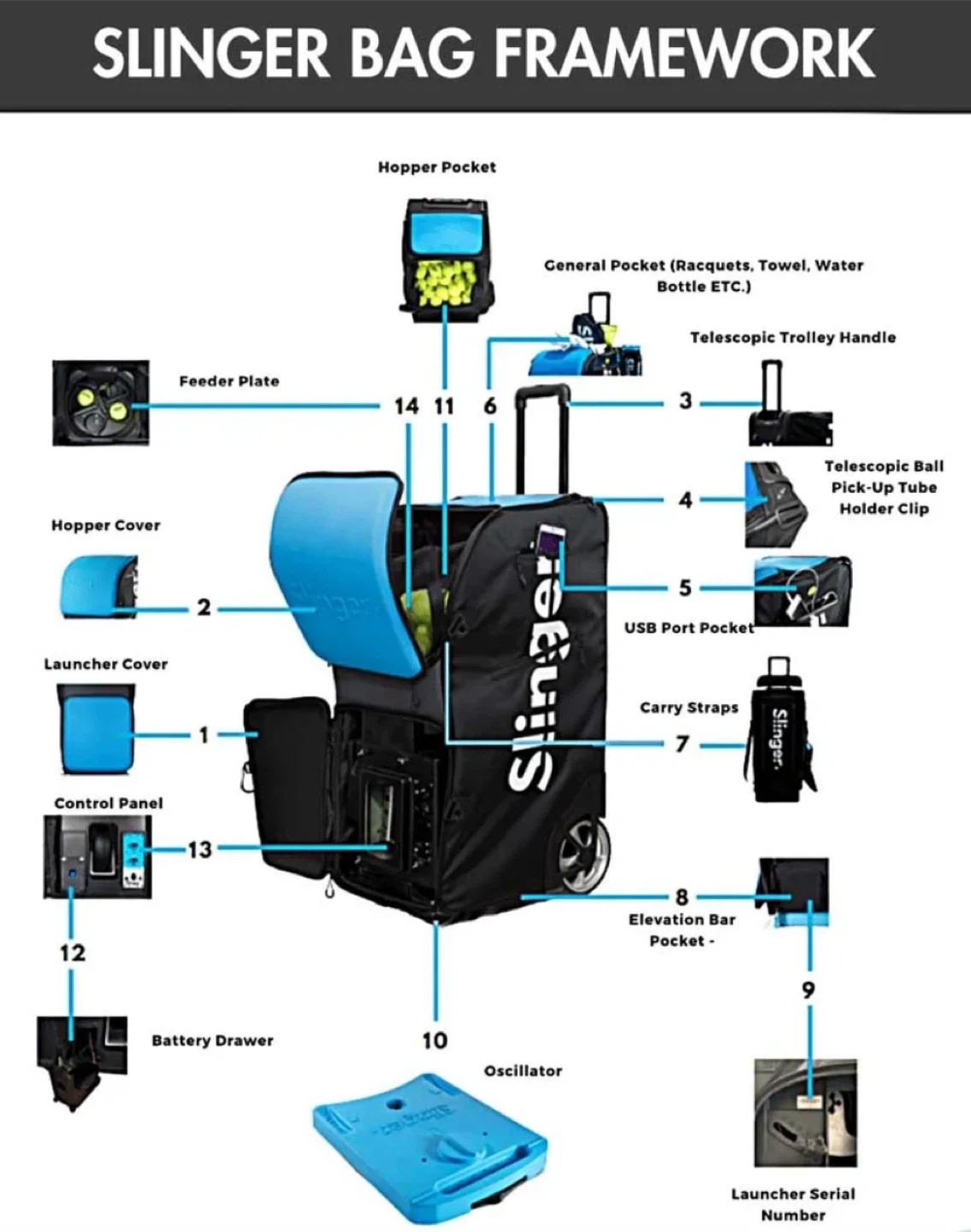 Selling a Slinger Bag tennis ball launcher! It's in great shape and ready to help you level up your tennis game. This bag is super handy for solo practice or working on specific shots. It's got lots of pockets for racquets, towels, and water bottles, plus a USB port for charging your devices. The telescopic trolley handle makes it easy to move around the court. Perfect for players of all levels
