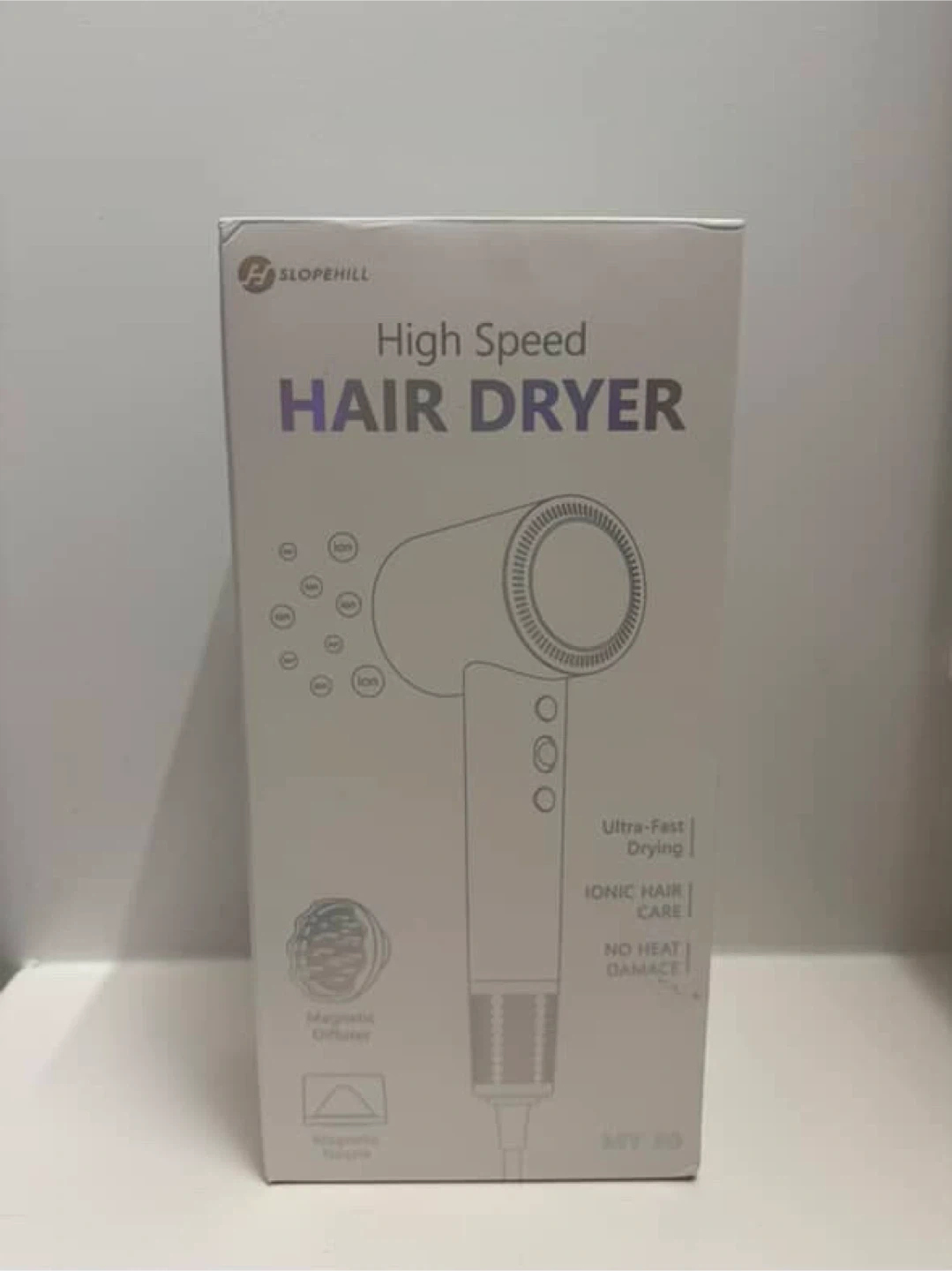 Selling a Slopehill High Speed Hair Dryer in excellent condition. It comes with the box and all original accessories, including the magnetic diffuser and charging base. This hair dryer uses ultra-fast drying technology and ionic hair care to minimize heat damage. It's lightweight and easy to use.