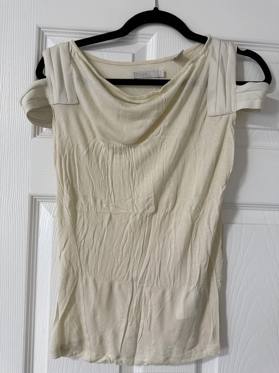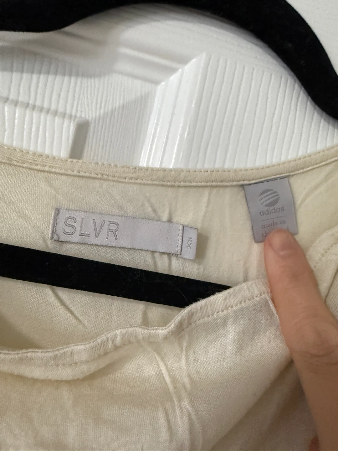 Selling a stylish cream-coloured top from SLVR, an Adidas brand! This top is a size XS and made with 100% modal material, making it super soft and comfortable. Perfect for a casual day out or dressing up for a night on the town!