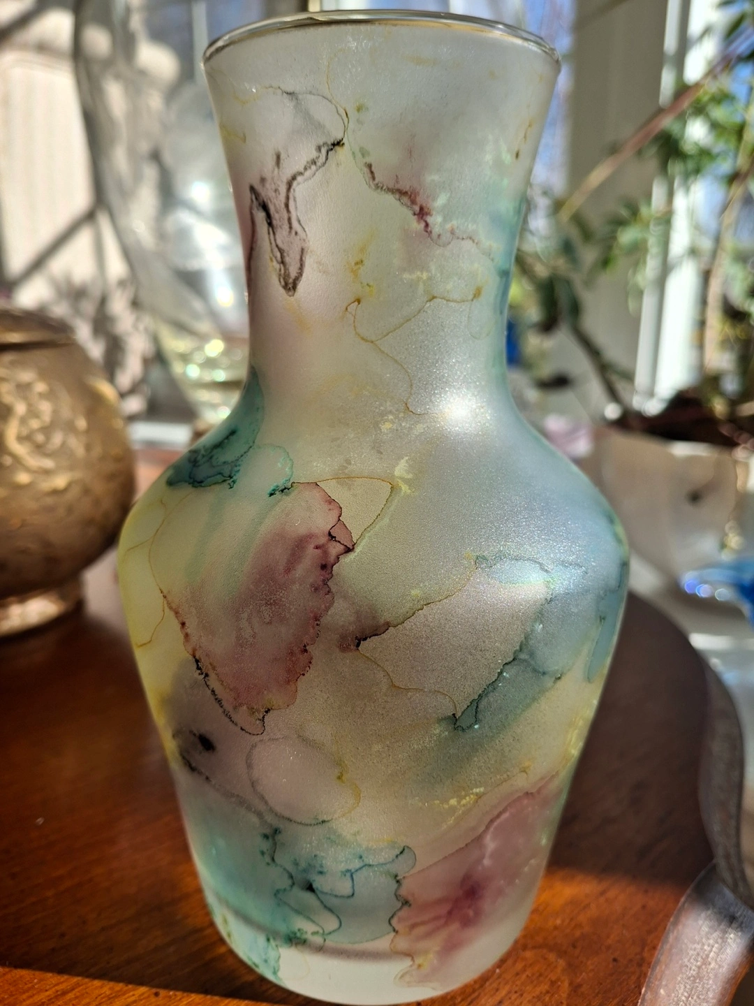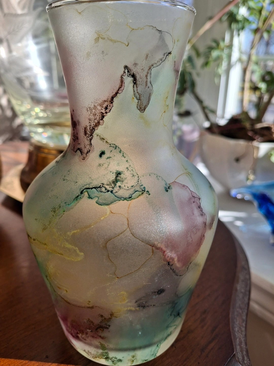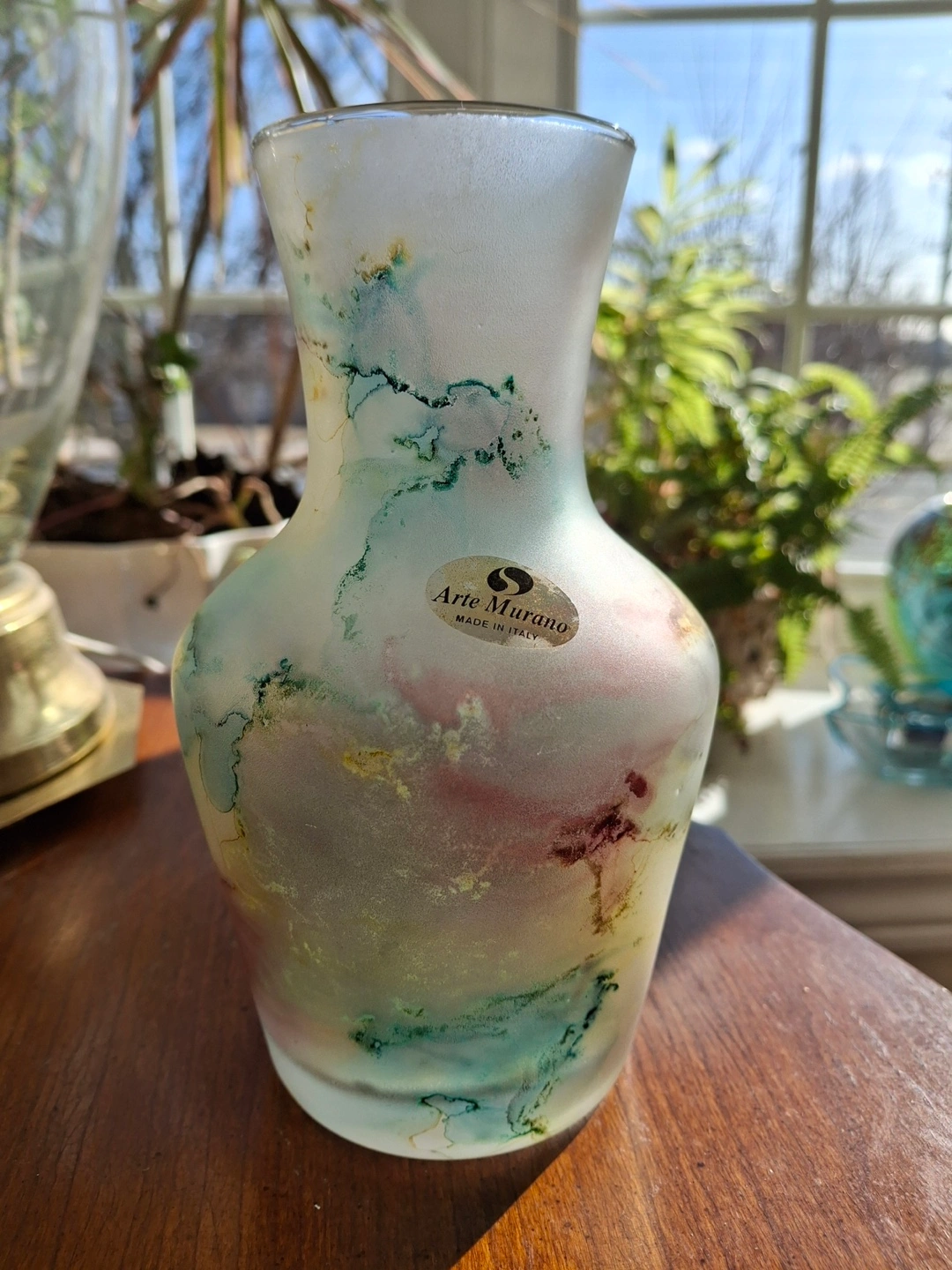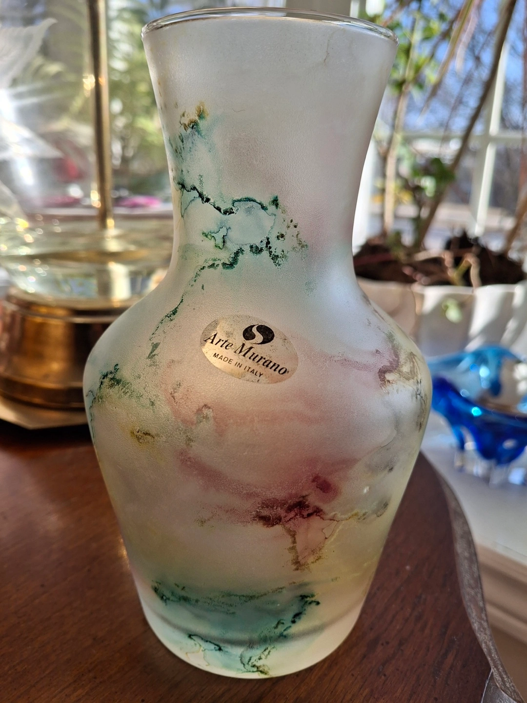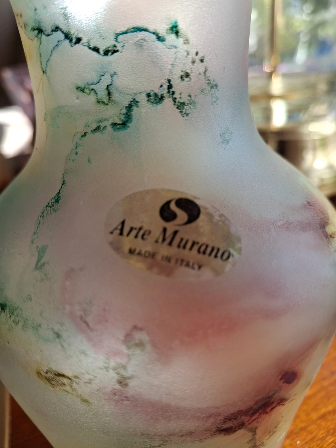 Arte Murano Italian vase. Beautiful glass vase with satin finish. Features colourful watercolour accents. Made in Italy. Small, elegant design. 6.5” tall. Never been used, sticker still on it. Available for pickup in Markland Wood.