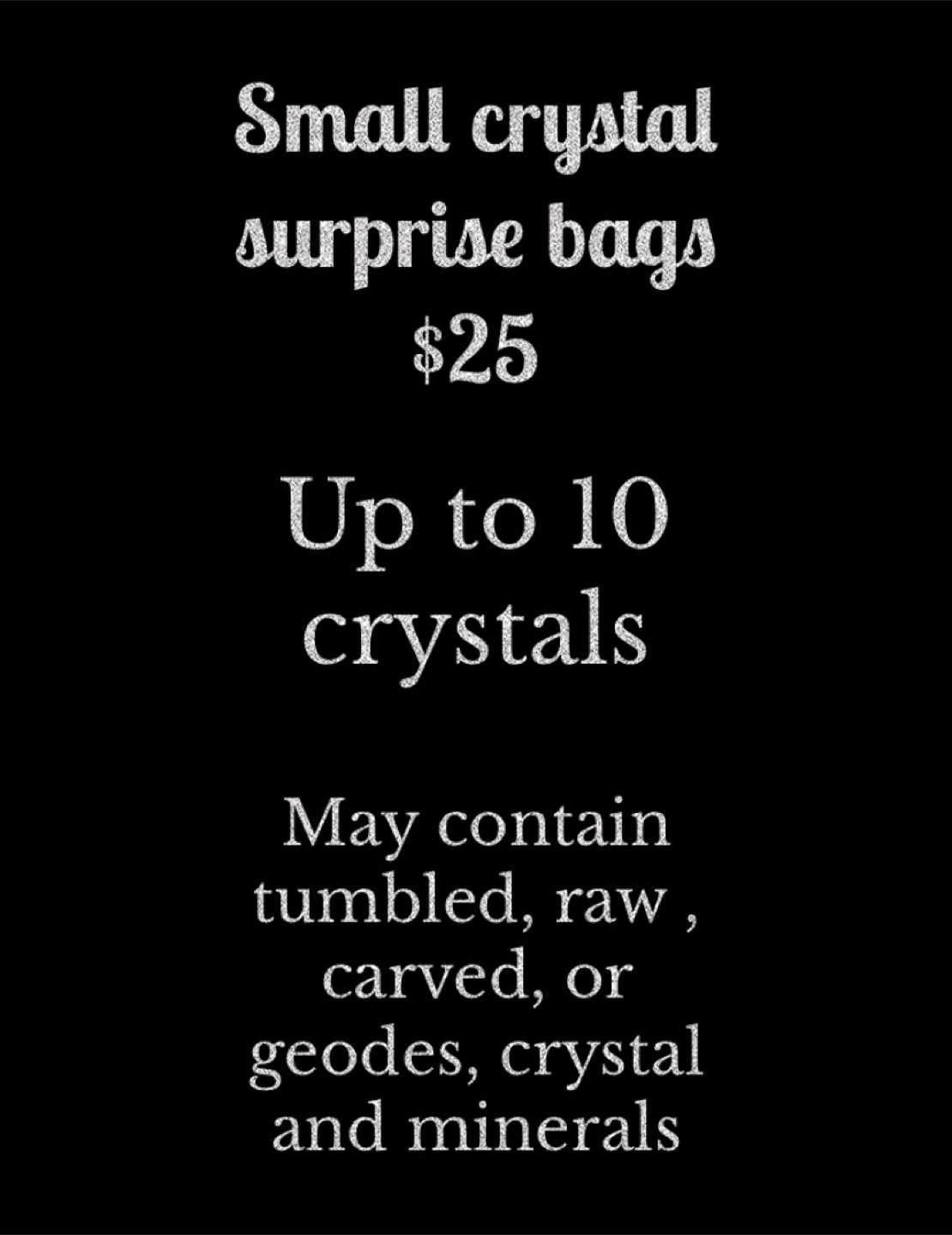 Selling small crystal surprise bags! Each bag contains up to 10 crystals, and may include tumbled, raw, carved, or geodes crystals and minerals. Perfect for a little present for a crystal lover!