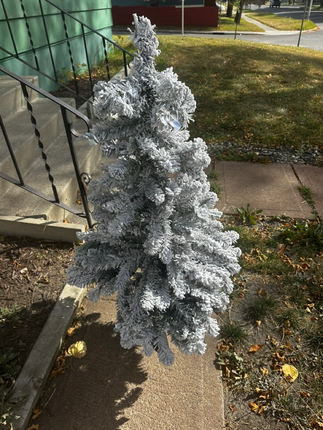 I'm selling a small flocked Christmas tree! It's perfect for adding a touch of winter wonderland to any space. It's in great condition and ready to bring some holiday cheer to your home