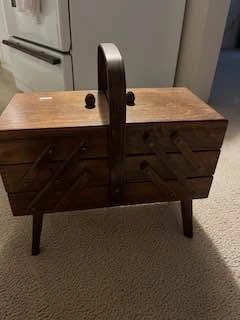 Lg sewing or jewelry box. Several compartments. Works very well open/close with ease. Handle for easy carry. No broken pieces.