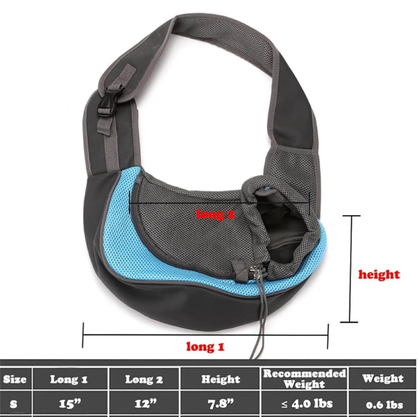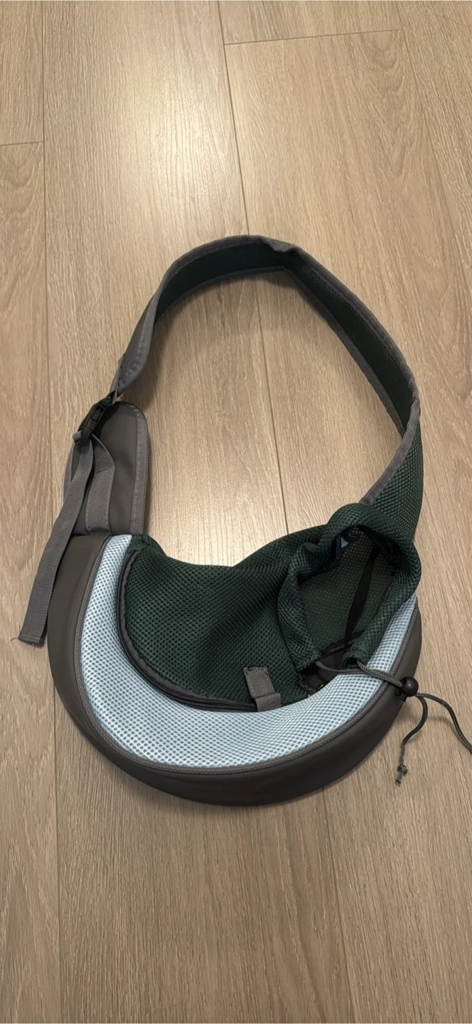 Selling a small pet carrier sling in great condition! It's grey and blue with a mesh section for ventilation. Perfect for carrying small dogs or cats, with a recommended weight of up to 4.0 lbs. Dimensions are approximately 15" long, 12" wide, and 7.8" high, making it a cozy and secure option for your furry friend