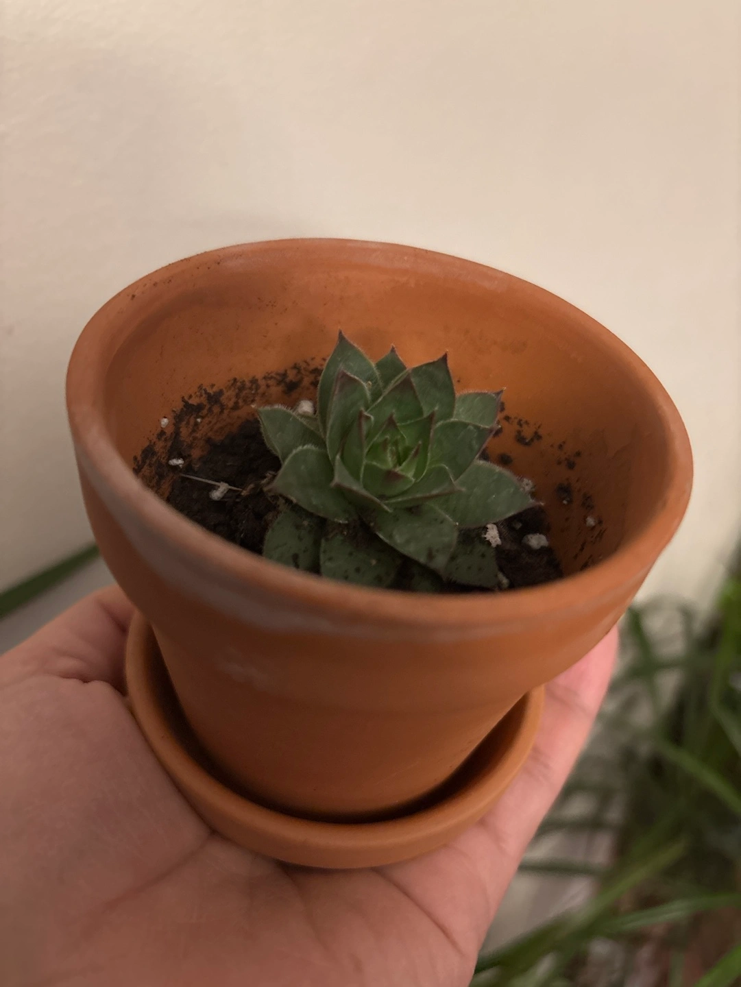 Small succulent planted in a terracotta pot with saucer. Healthy-looking plant. Perfect for a small space.