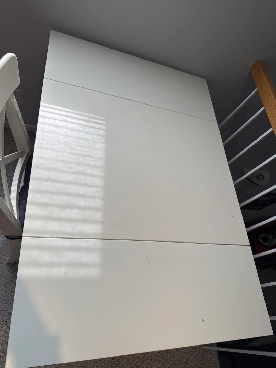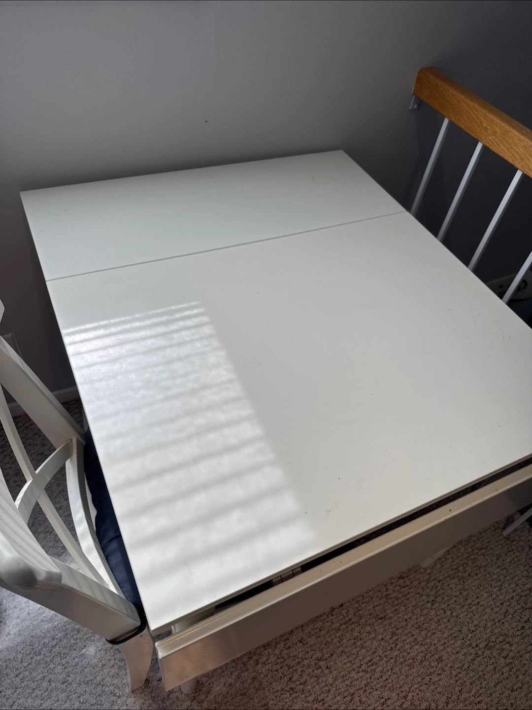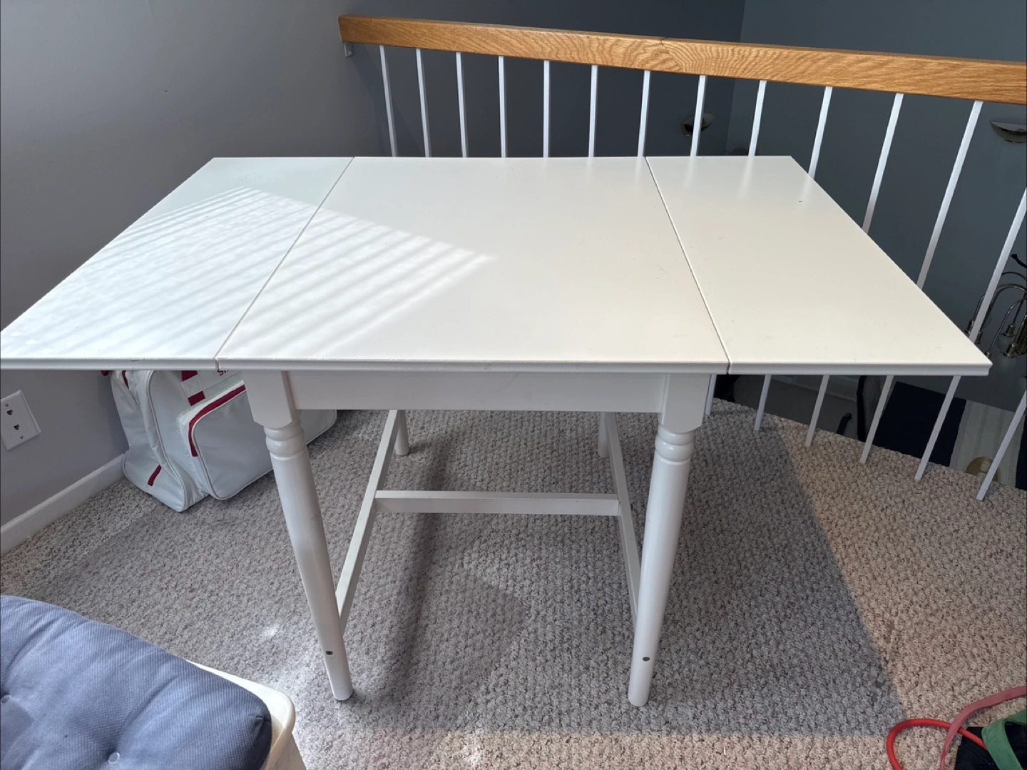 A *very* well-loved IKEA Ingatorp table with two chairs—because let’s be real, you’re not saying "Ingatorp" three times fast without sounding like a malfunctioning GPS. 😂 This table has been my trusty sewing sidekick, patiently enduring all my crafty chaos. It’s got a few battle scars (aka scratches), but nothing a quick paint job can’t fix—or just embrace them like I did and call it *artistic flair*. The table measures 30.5 inches by 23.5 inches with the wings folded down, but flip those bad boys up and it expands to a full 46 inches wide—perfect for dinners, puzzles, or aggressively spreading out your sewing projects. It stands 28.5 inches tall, which is ideal for avoiding knee bumps (unless you’re clumsy like me, in which case, good luck), and has a small drawer for hiding your crafting bits. It comes with two chairs sporting comfy blue cushions, tested extensively by human behinds and occasionally by my cat. The whole set comes from a smoke-free home, though I can’t promise it’s 100% fur-free—consider it a texture experience. **PHOTO NOTE:** The sewing machine and serger chilling on the table in the photo are *strictly for size reference* (and also because I have no other flat surfaces left in my house). They are **NOT** included—sorry. Great for small spaces, crafters, or anyone who enjoys the thrill of folding/unfolding furniture like a weird little Transformer. Pick up in Stittsville. Can be disassembled for easier transportation