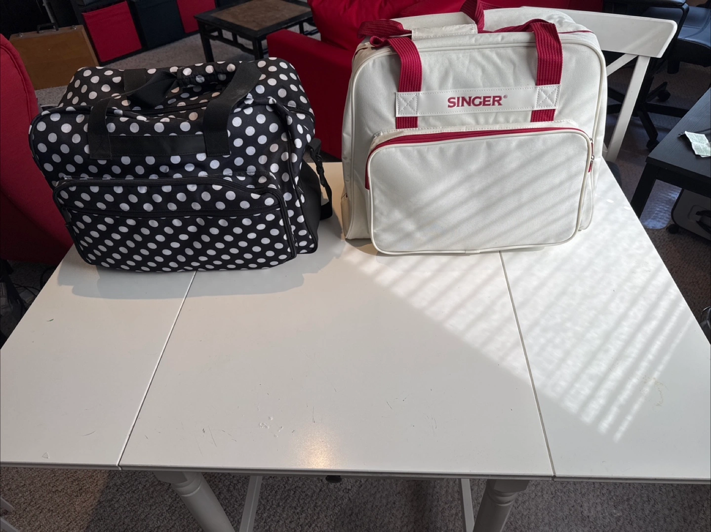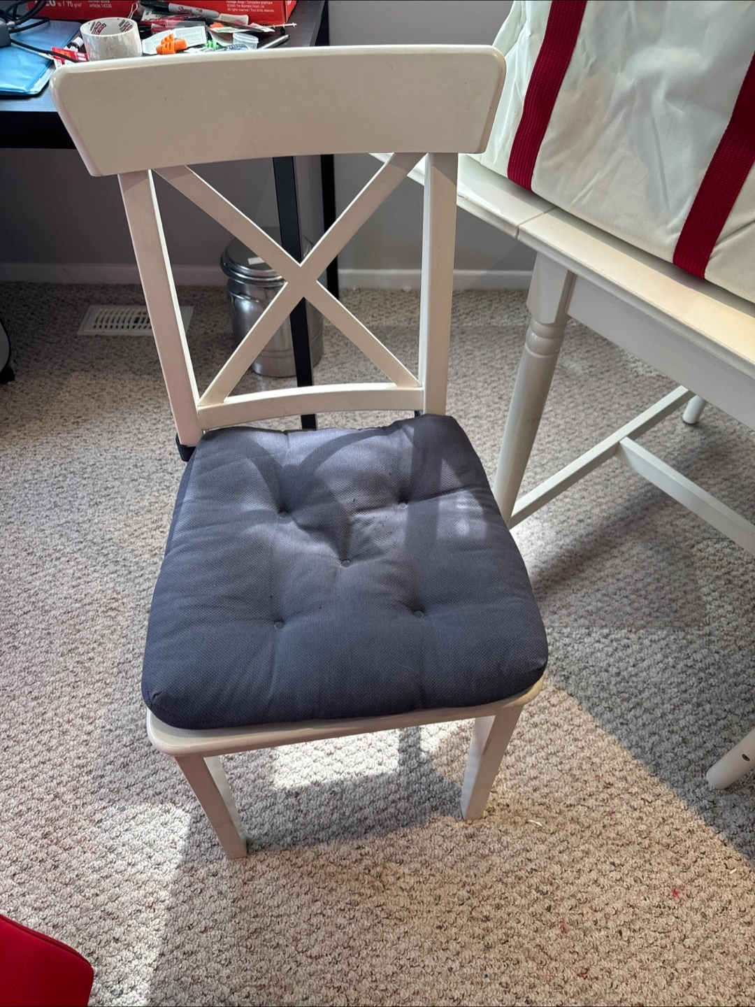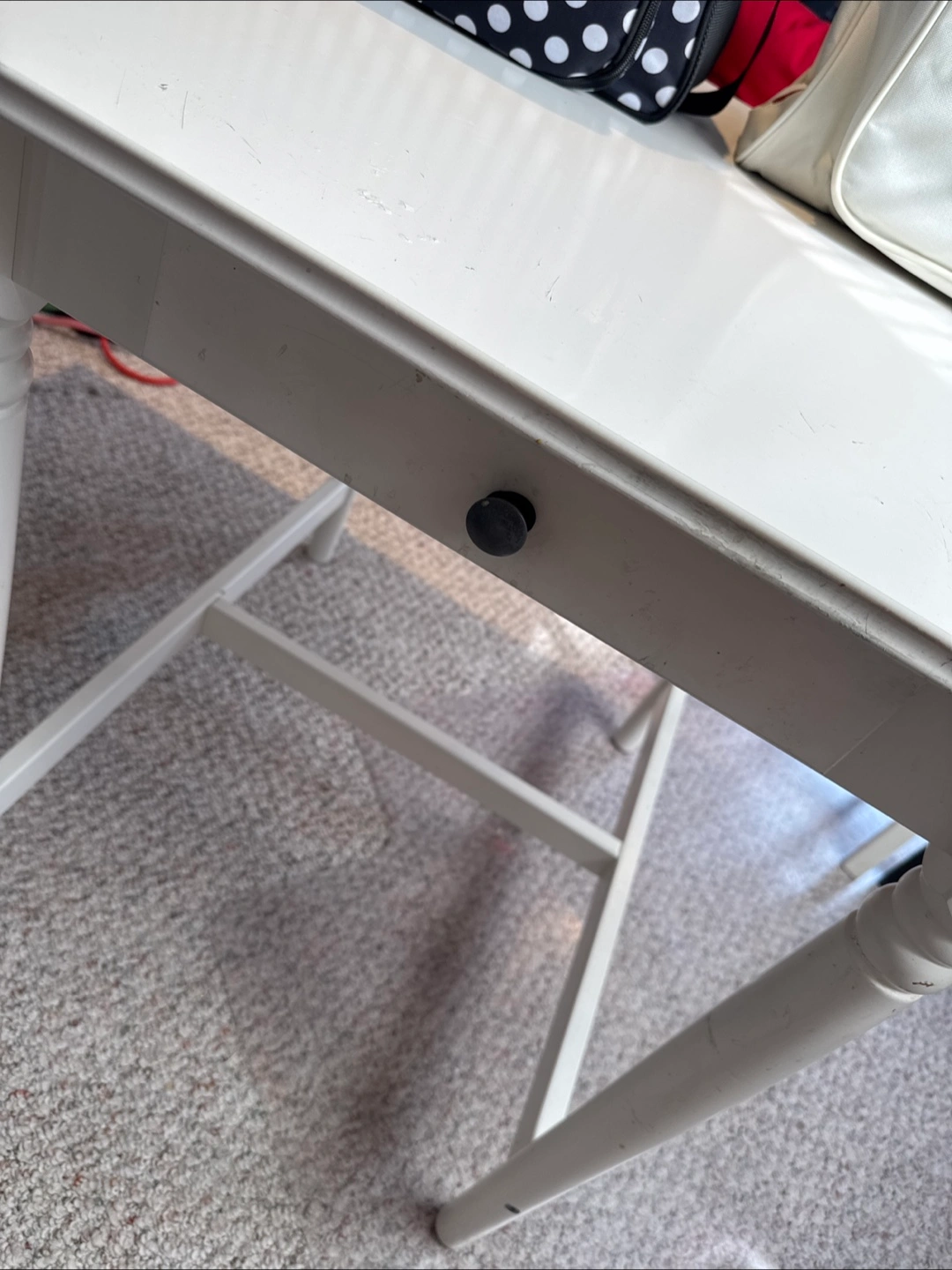 A *very* well-loved IKEA Ingatorp table with two chairs—because let’s be real, you’re not saying "Ingatorp" three times fast without sounding like a malfunctioning GPS. 😂 This table has been my trusty sewing sidekick, patiently enduring all my crafty chaos. It’s got a few battle scars (aka scratches), but nothing a quick paint job can’t fix—or just embrace them like I did and call it *artistic flair*. The table measures 30.5 inches by 23.5 inches with the wings folded down, but flip those bad boys up and it expands to a full 46 inches wide—perfect for dinners, puzzles, or aggressively spreading out your sewing projects. It stands 28.5 inches tall, which is ideal for avoiding knee bumps (unless you’re clumsy like me, in which case, good luck), and has a small drawer for hiding your crafting bits. It comes with two chairs sporting comfy blue cushions, tested extensively by human behinds and occasionally by my cat. The whole set comes from a smoke-free home, though I can’t promise it’s 100% fur-free—consider it a texture experience. **PHOTO NOTE:** The sewing machine and serger chilling on the table in the photo are *strictly for size reference* (and also because I have no other flat surfaces left in my house). They are **NOT** included—sorry. Great for small spaces, crafters, or anyone who enjoys the thrill of folding/unfolding furniture like a weird little Transformer. Pick up in Stittsville. Can be disassembled for easier transportation