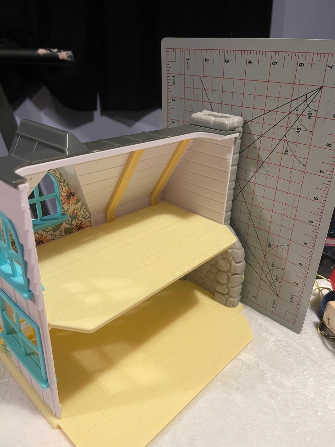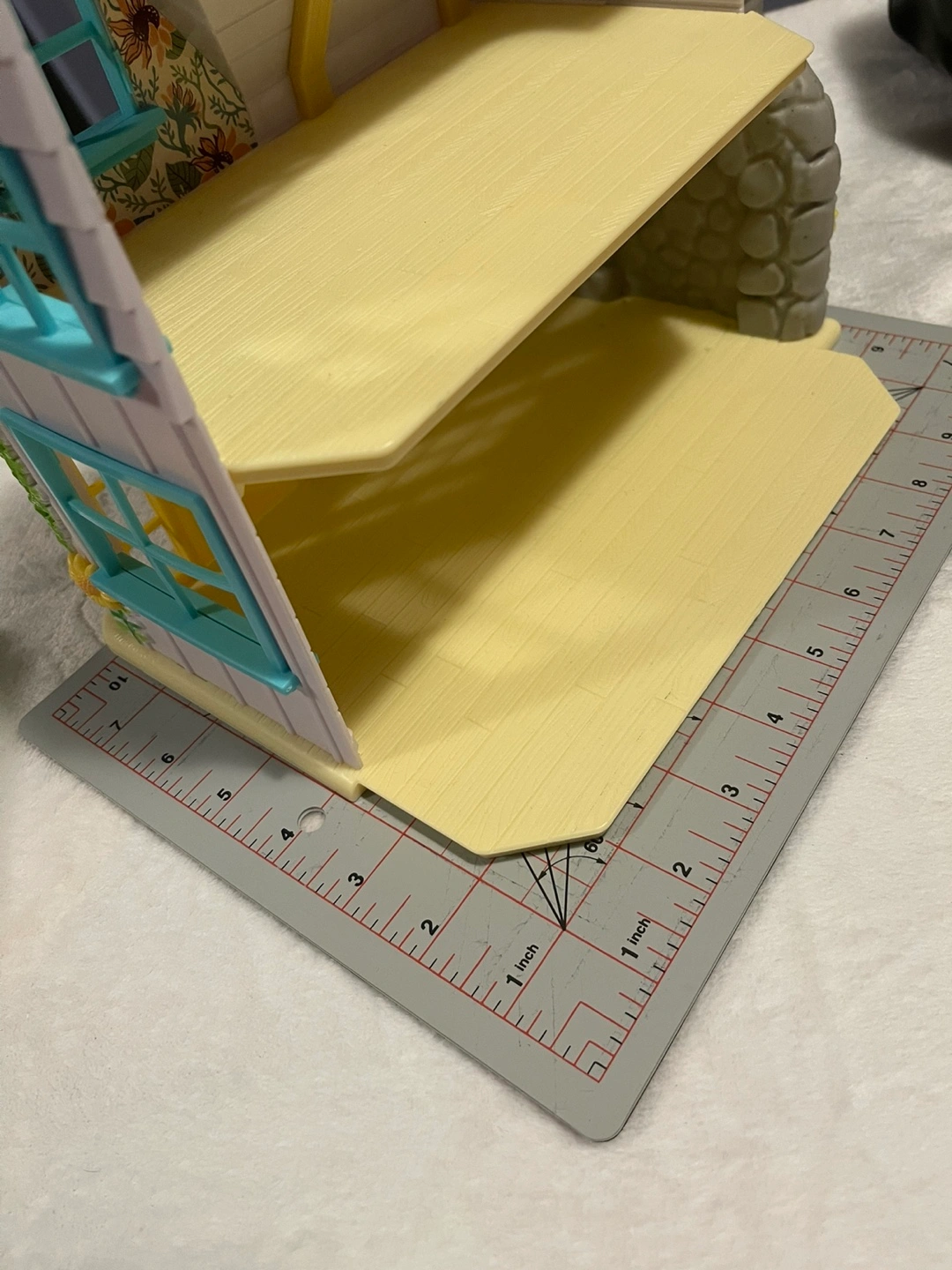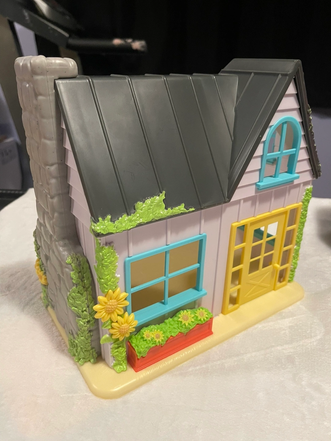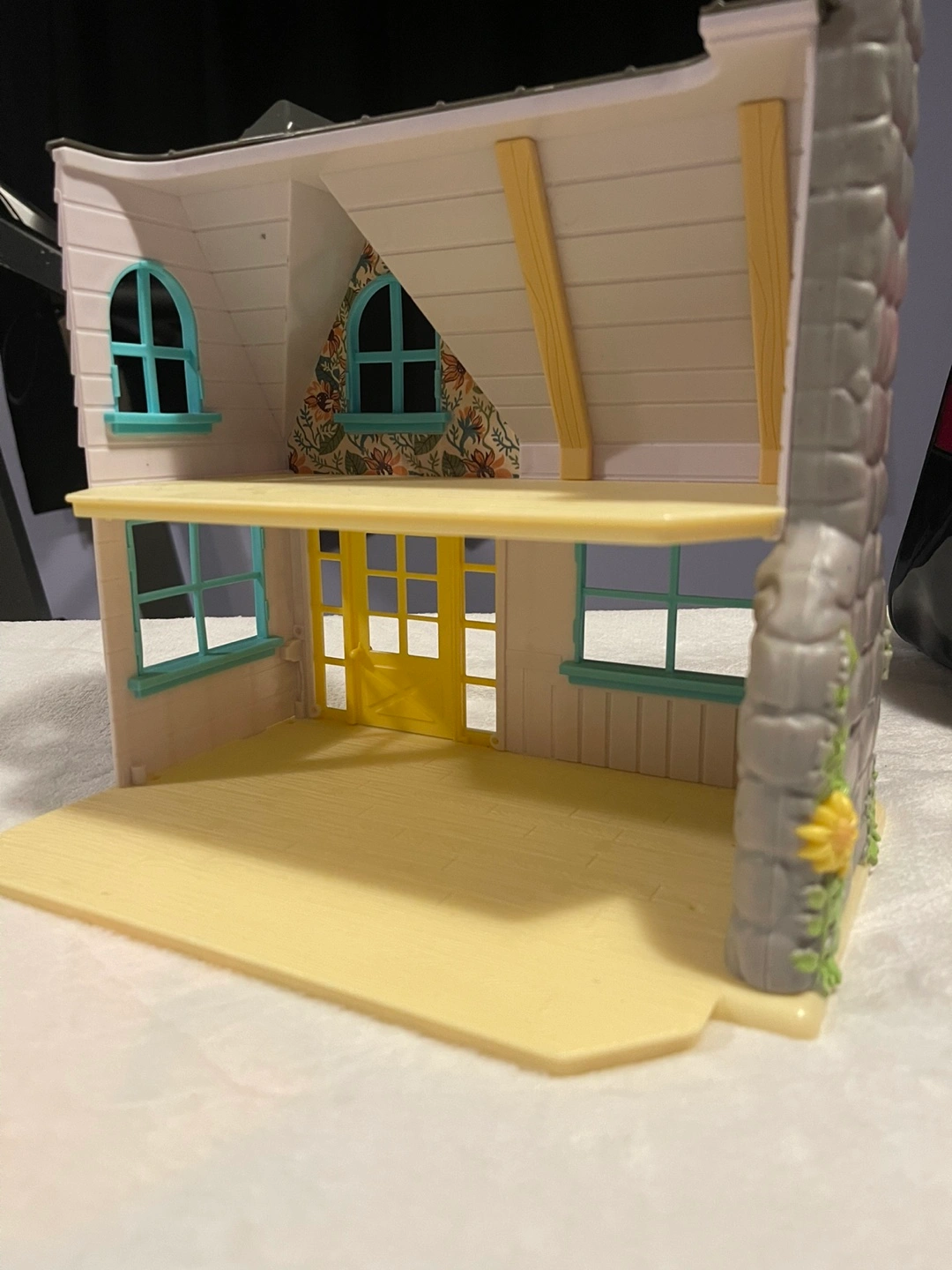 Doll house suitable for calico critters or similar size toys. Cute little playhouse, two stories. Features a yellow door, teal windows, and sunflower accents. Great for imaginative play.