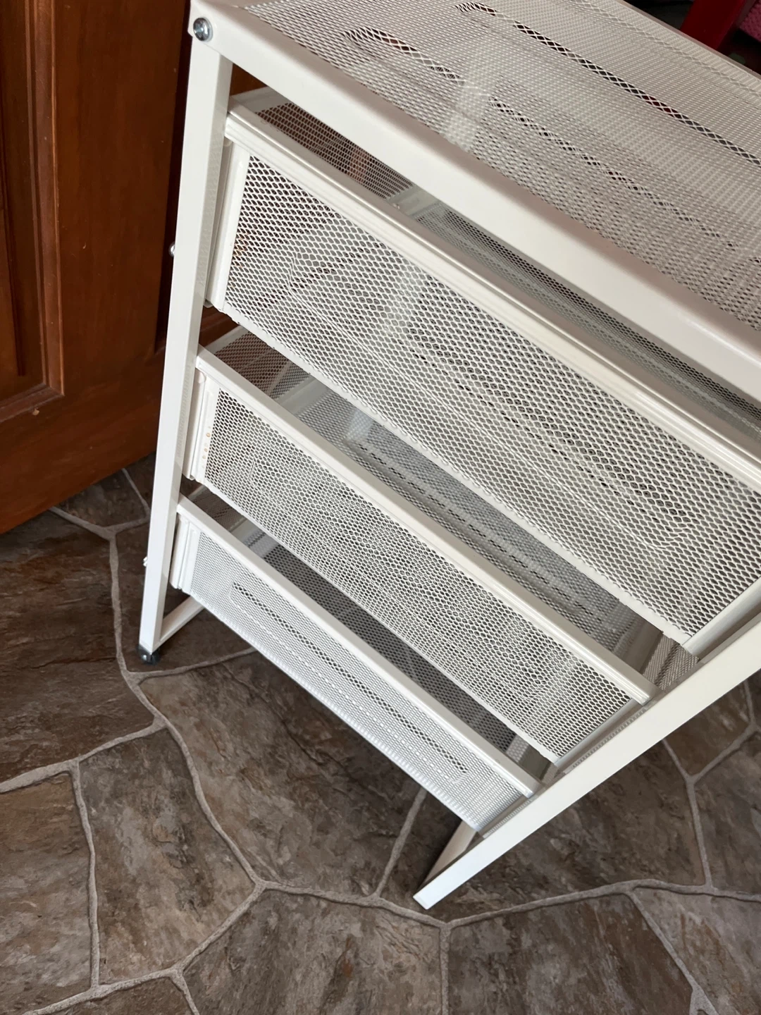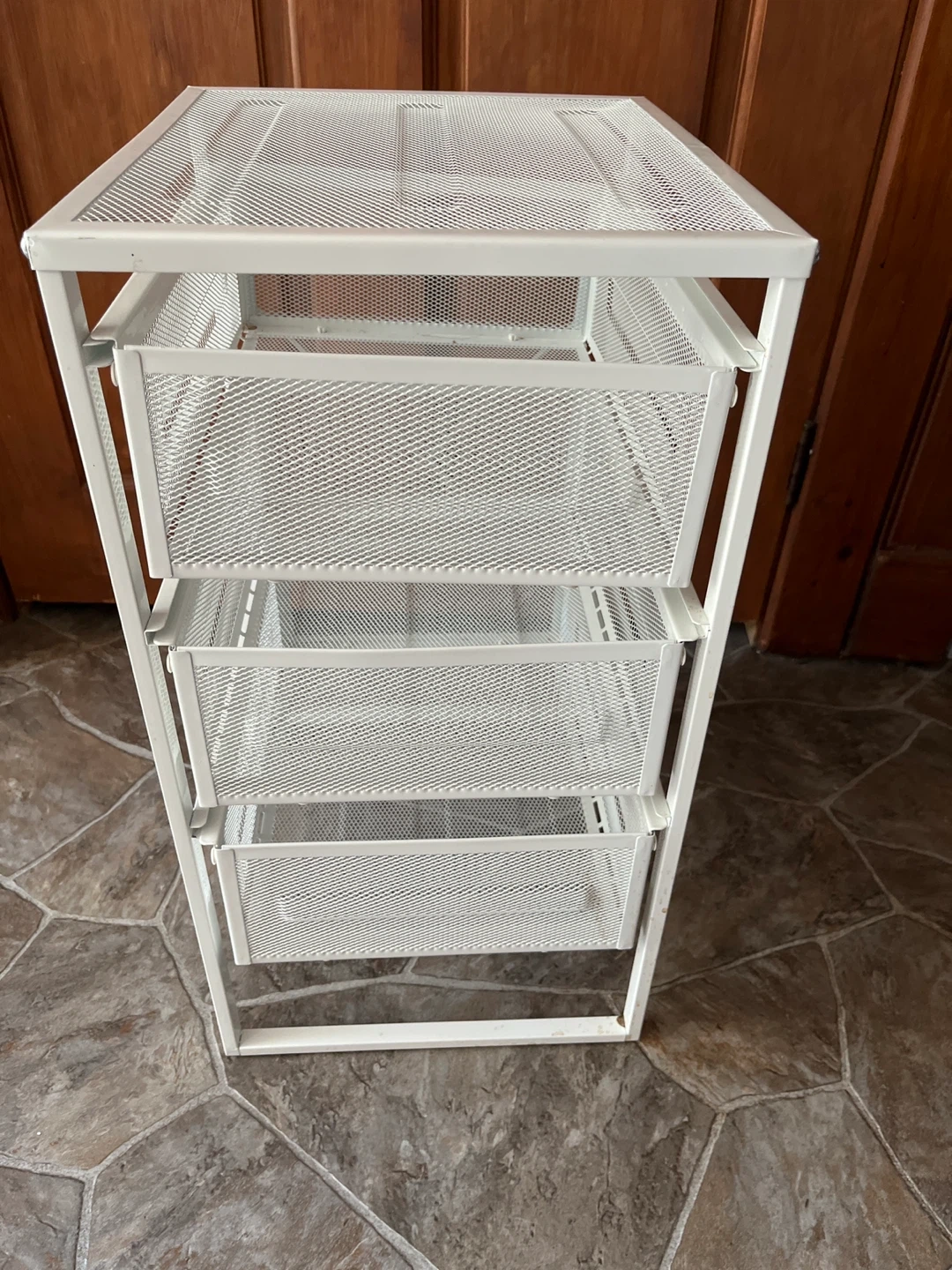Here's a handy white metal mesh drawer unit, perfect for storage in any room! It has three drawers and is in great shape. It's lightweight and easy to move around, so it's great for organizing your space