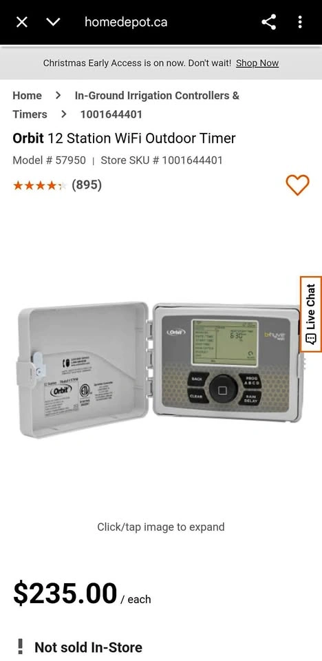 Orbit 12 Station WiFi Outdoor Timer - Model #57950 Upgrade your outdoor watering system with this Orbit 12 Station WiFi Outdoor Timer. This timer allows you to control your irrigation system remotely and schedule watering sessions with ease. Features: - 12-station capacity for multiple watering zones - WiFi connectivity for remote access and scheduling - Durable outdoor design for withstanding various weather conditions Details: - Condition: New - Model #: 57950 - Original Price: $260 - Selling for $170