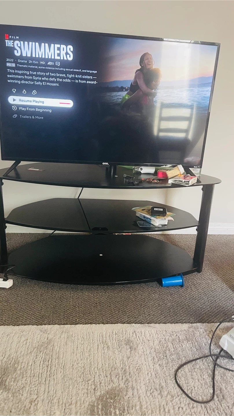 Selling a smart TV 43 inches with the stand with multiple shelves. It's in good condition and perfect for organizing your media components and accessories. Great for any living room setup!