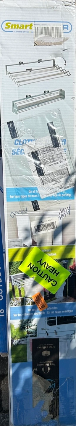 This SmartDRYER is perfect for your RV or camper! It's designed to be easily fixed onto an RV or 5th wheel ladder. It's very stable and rust resistant, plus it can support up to 50 pounds of clothes. It's also great as an indoor retractable clothing rack, and the installation kit is included The SmartDryer 0030 is a retractable clothes drying rack, designed for small spaces. It can be installed inside or outside your home and easily folds up when not in use to save space. Versatile: For outdoor use on balconies, railings, fences and all types of recreational vehicles, but also for indoor use, wall mounting if desired. Retractable = space saving. Easy to Install: Easy to install patented unique handles that can be adjusted in length and width to fit any type of balcony, railing, RV ladder. Stronger and more durable than any other dryer as it is made of rust-resistant stainless steel, durable and ideal for outdoor use. Does not require screwing during outdoor installation thanks to its patented gripping system BRAND NEW - open box Rods: 9 rods, made of high quality stainless steel Frame: sturdy steel, powder coated Installation kit included. Dimensions: OPEN – 46" x 25" x 7.75" CLOSED – 46" x 5.5" x 7.75"