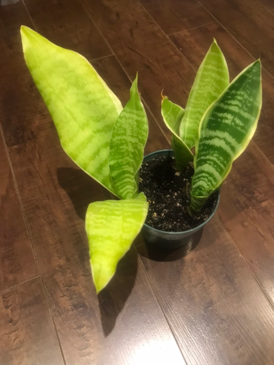 Sansevieria/dracaena trifasciata laurentii 3 plants in a plastic 4.5 inch pot. The leaves are about 5-7 inches (15cm) tall and have a horizontal striped pattern with yellow variegation on the edges. Low maintenance/easy care. Watering schedule: About once a month (depending on how long it takes the soil to dry out in your home environment). Light: Any (it’s not picky, it’ll grow in low, medium and high light environments). The leaves will grow a lighter colour under high light and a darker under lower light.