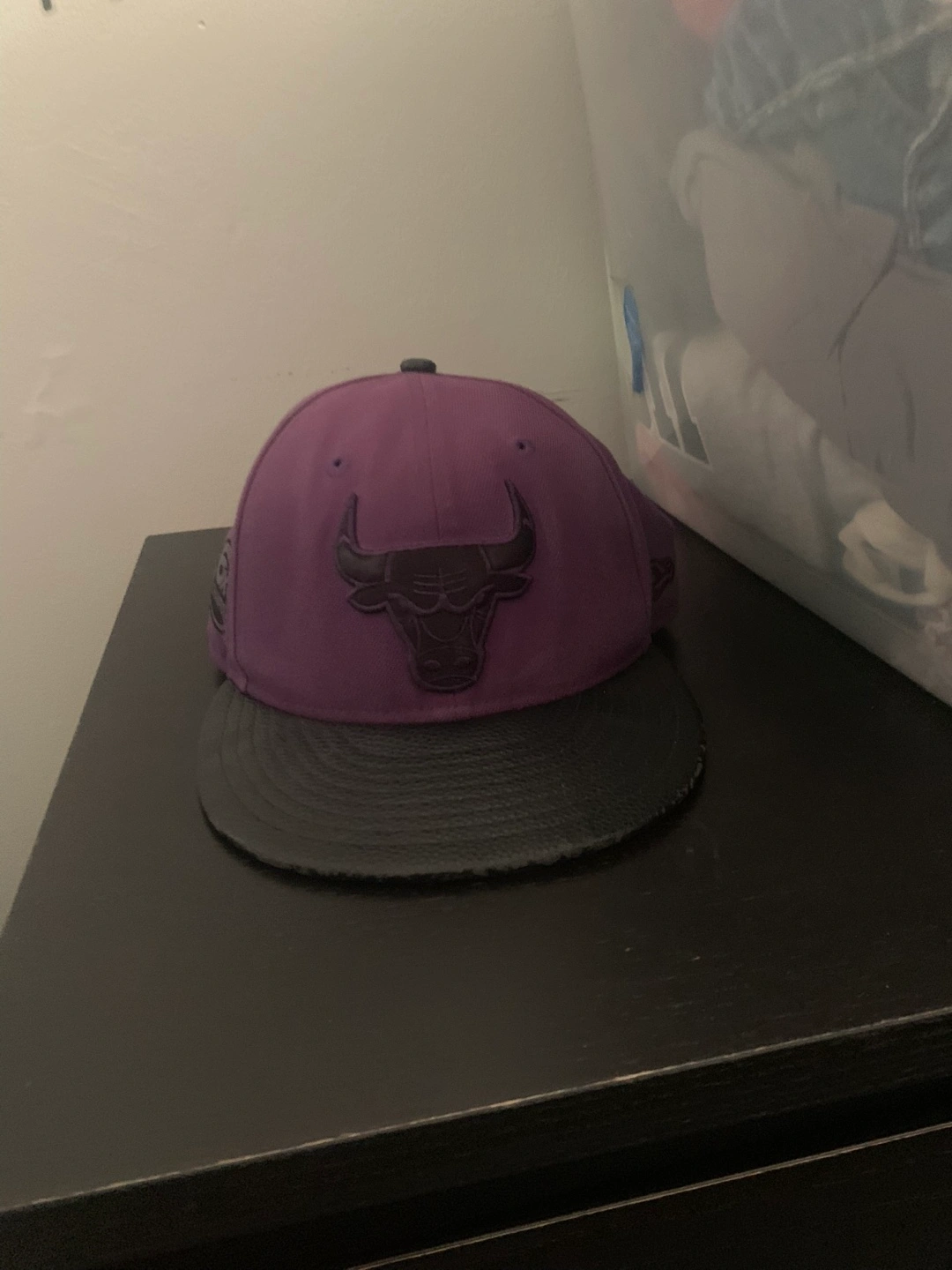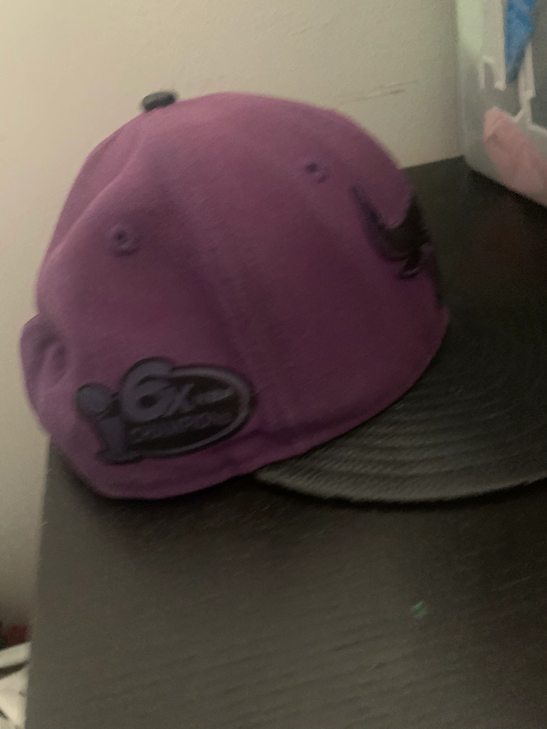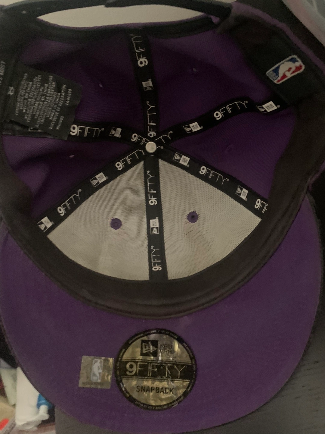Three purple New Era 9Fifty snapback hats. One features the Los Angeles Lakers logo, another the Chicago Bulls logo, and the third has a 16x Champion logo. All hats have a black brim.