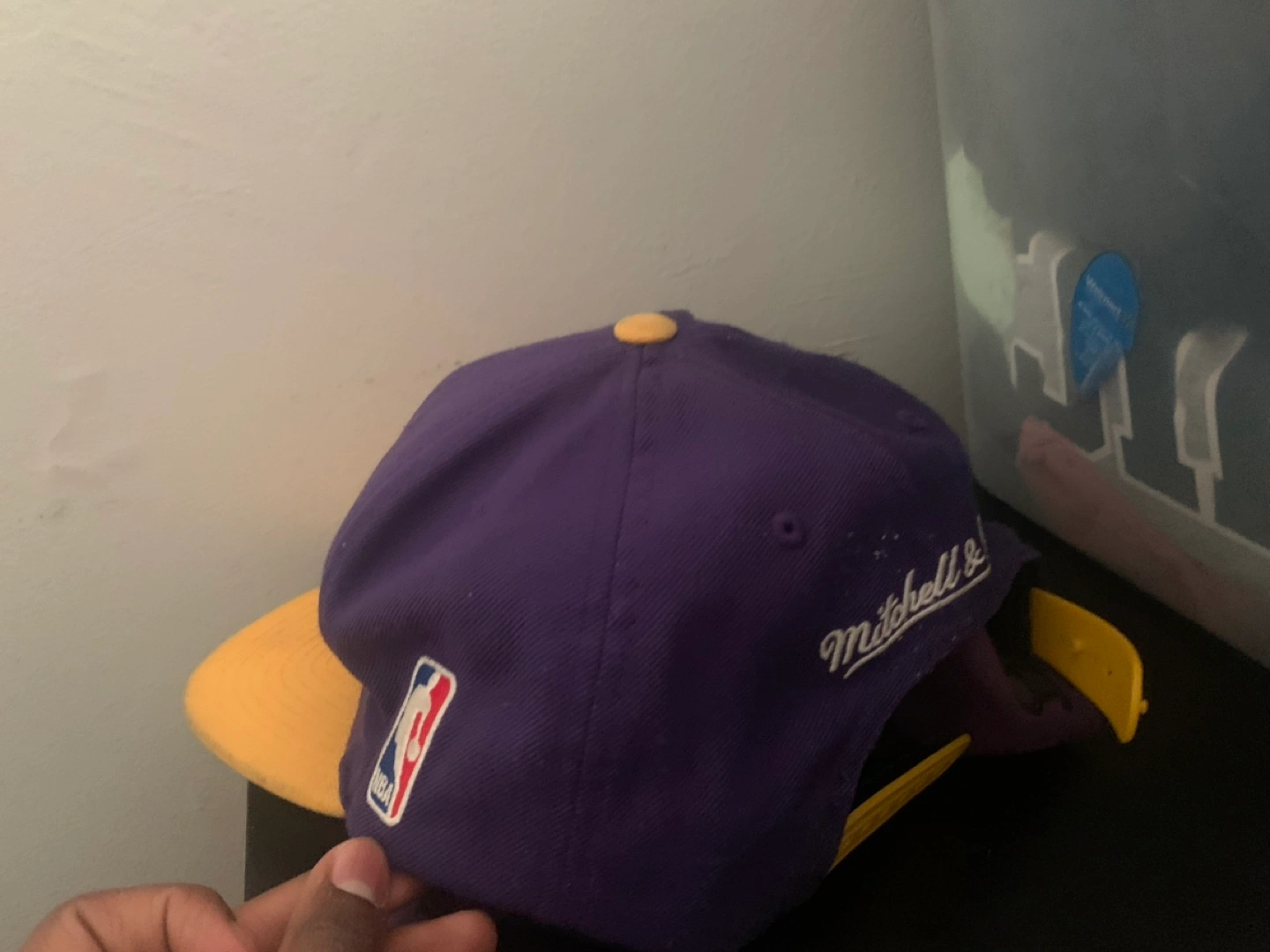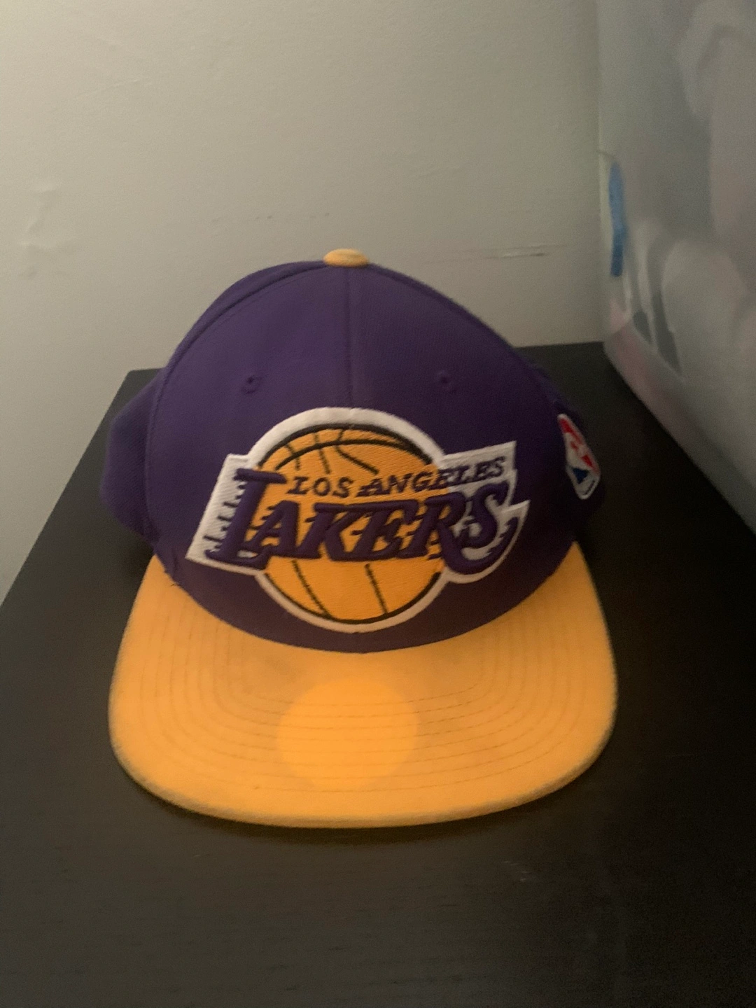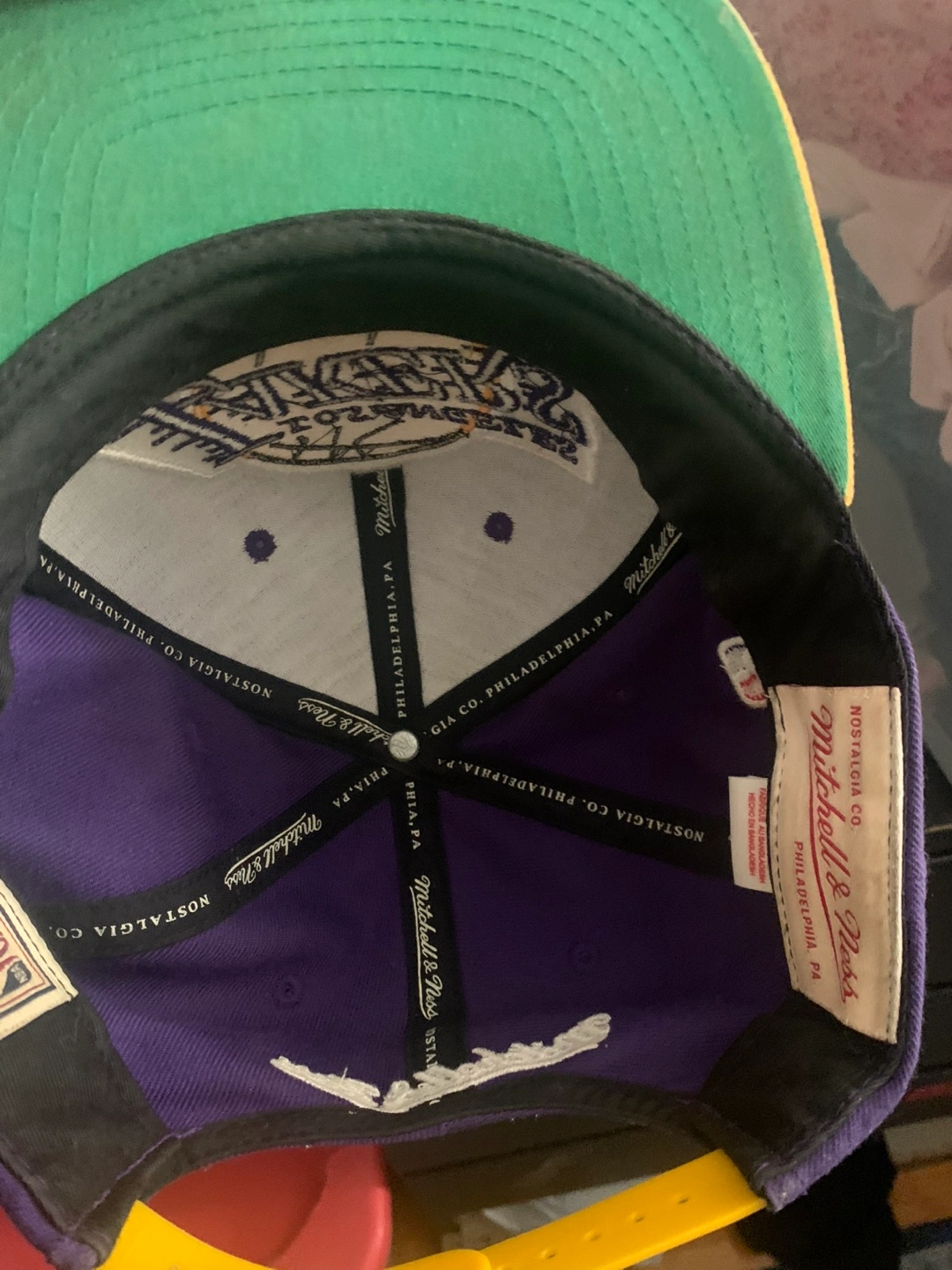 Three purple New Era 9Fifty snapback hats. One features the Los Angeles Lakers logo, another the Chicago Bulls logo, and the third has a 16x Champion logo. All hats have a black brim.