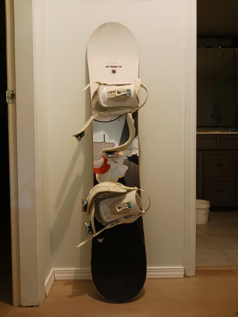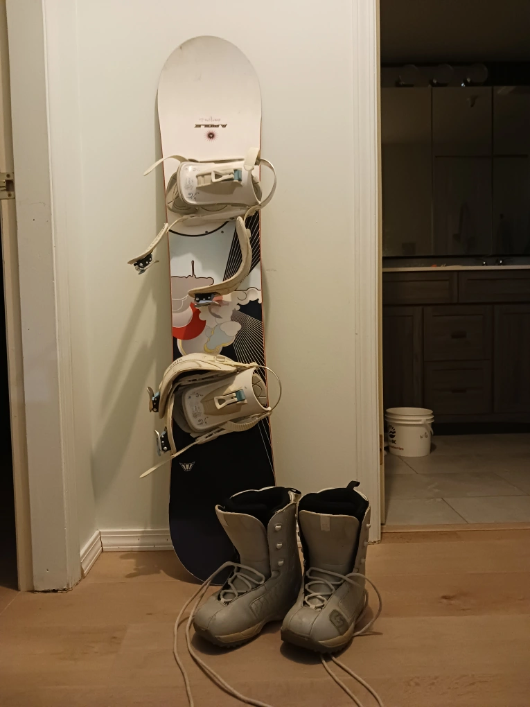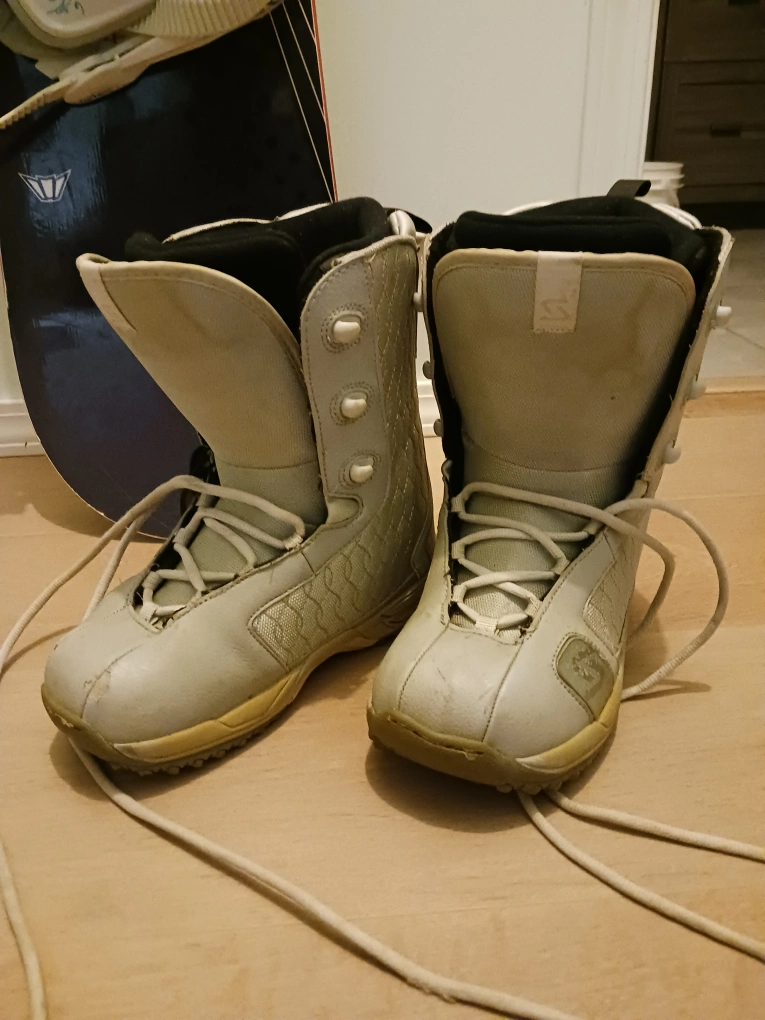 Selling a used Mole Emotion Snowboard (53 in x 9 in) with bindings and a pair of snowboard boots (size 6 womens). The boots are a light grey colour. Great for hitting the slopes!
