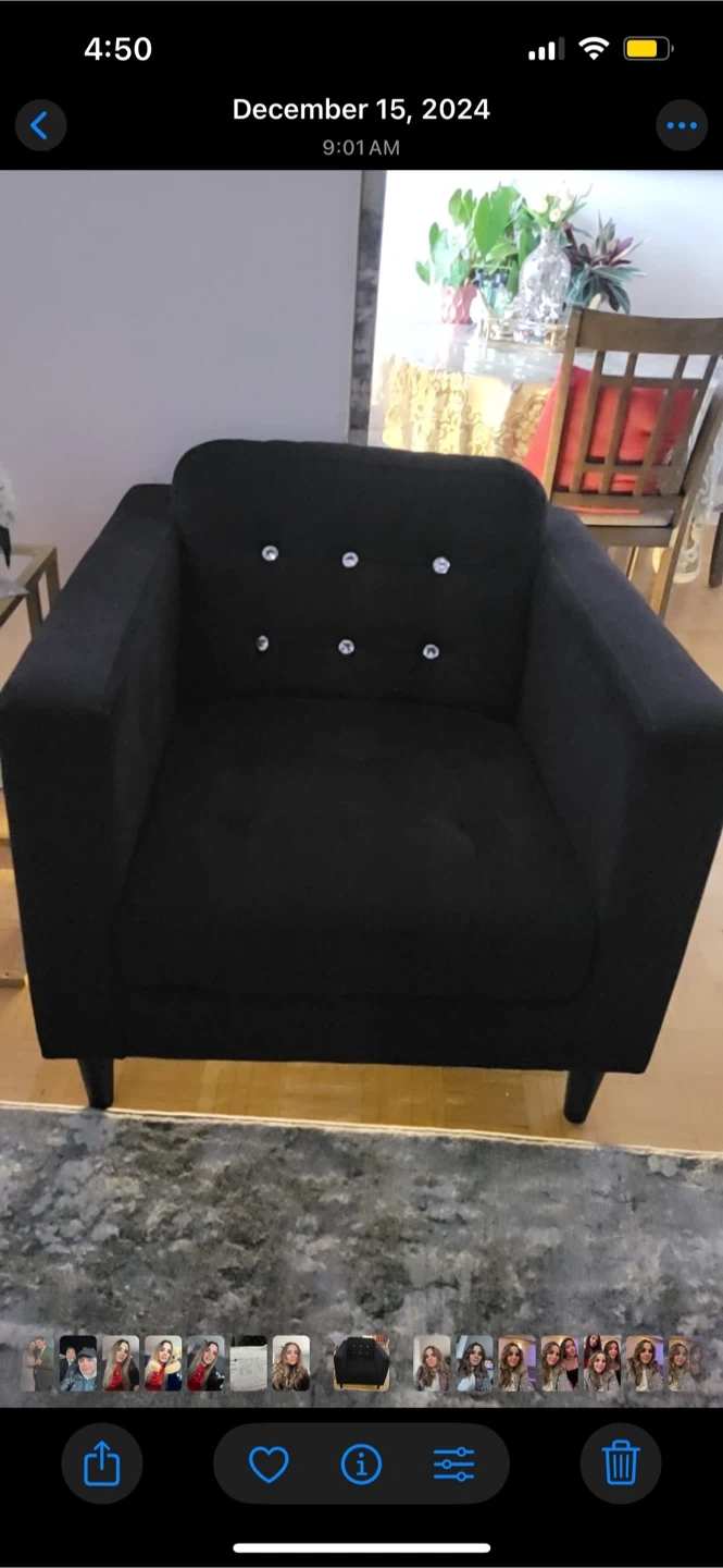 Selling a sofa for 250 and matching armchair for 150$ set. Both pieces are in good condition and feature a sleek, modern design with decorative button accents. The set is a stylish addition to any living space!
