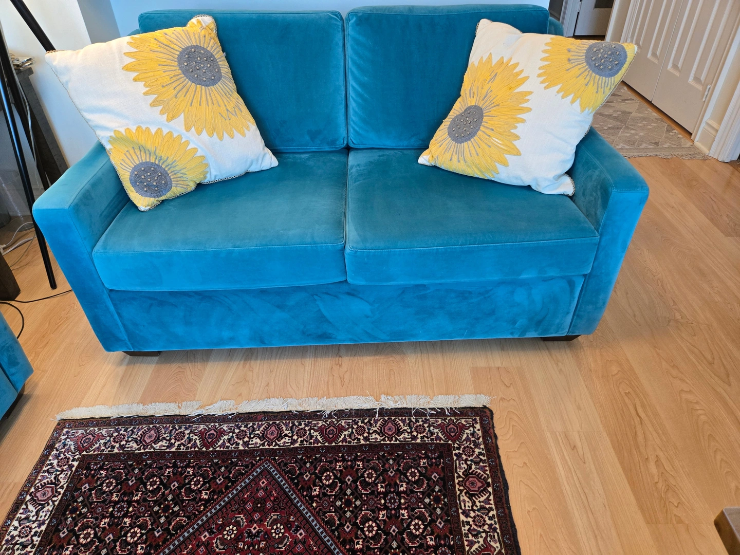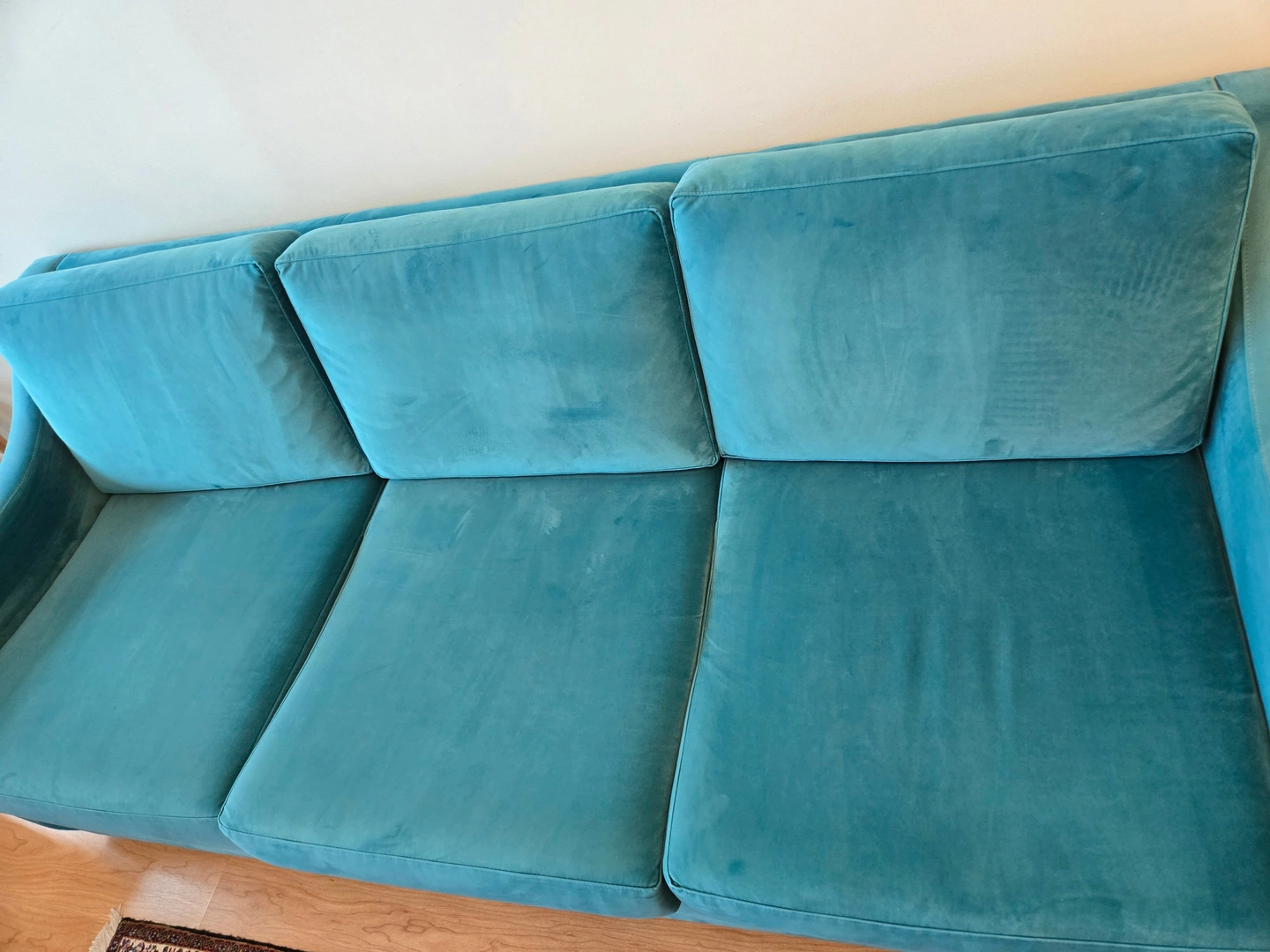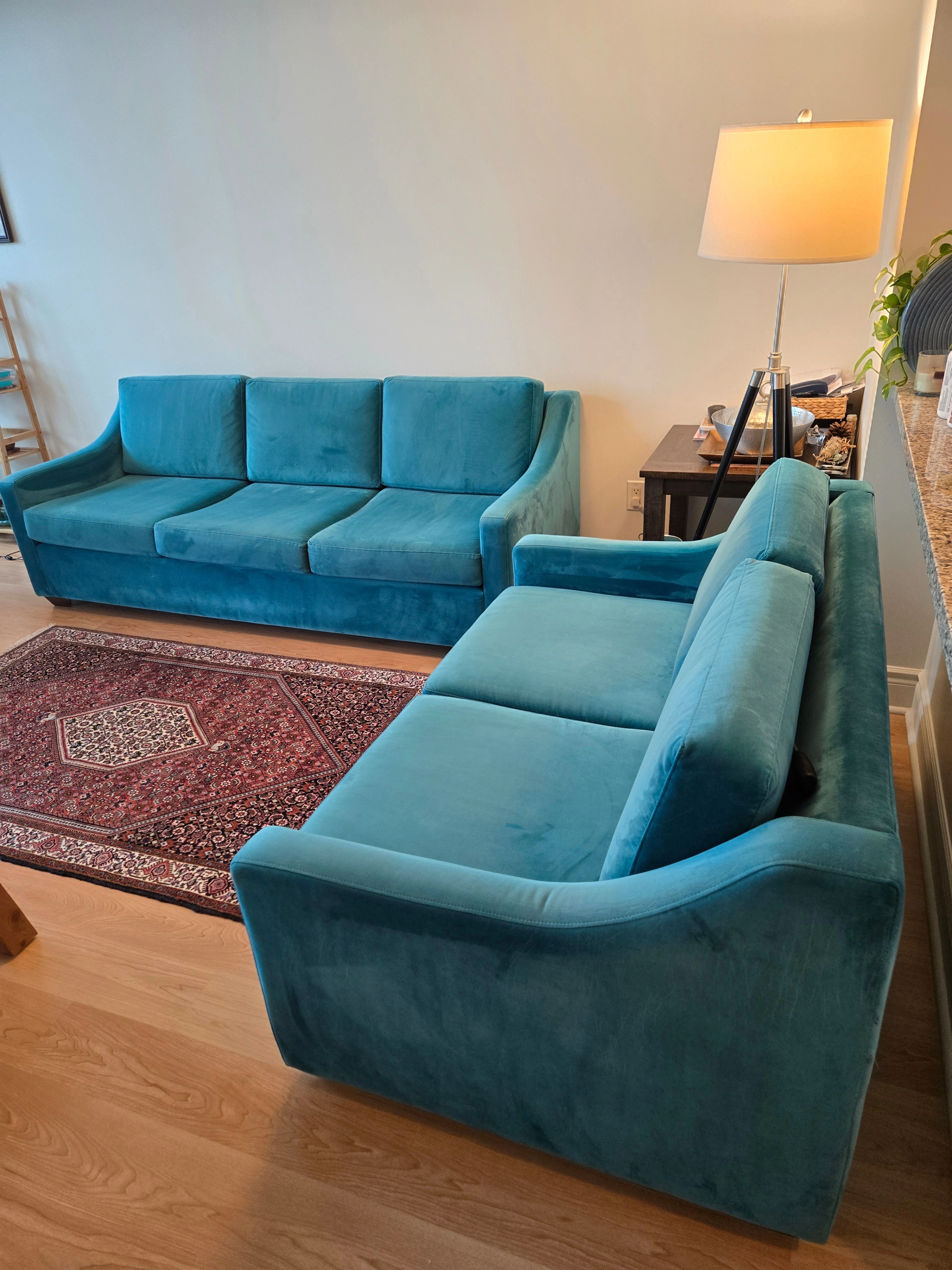 Two beautiful, excellent-condition sofas for sale! This set includes a full-size sofa and a matching loveseat, both in a stunning teal velvet. The color is vibrant, and the fabric is incredibly soft. They're perfect for adding a pop of color to your living room or family room. We've kept them in great shape, with no tears, stains, or damage. They're clean, comfortable, and ready for a new home. We're selling them as a set for $500.