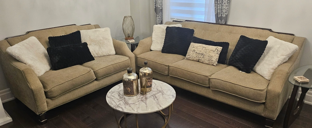 Selling a comfy sofa and loveseat set. The neutral colour makes it easy to match with any decor. Perfect for a living room or family room. The set is in good condition and ready for a new home. Decorative cushions are also included. 350or best offer. negotiable