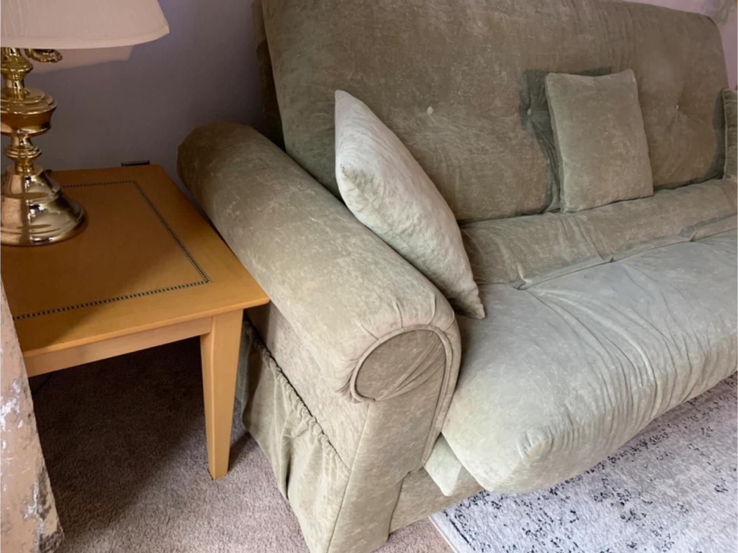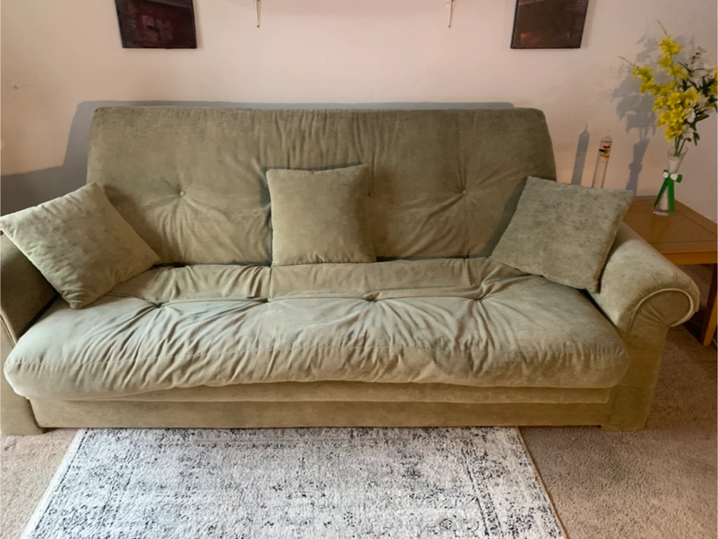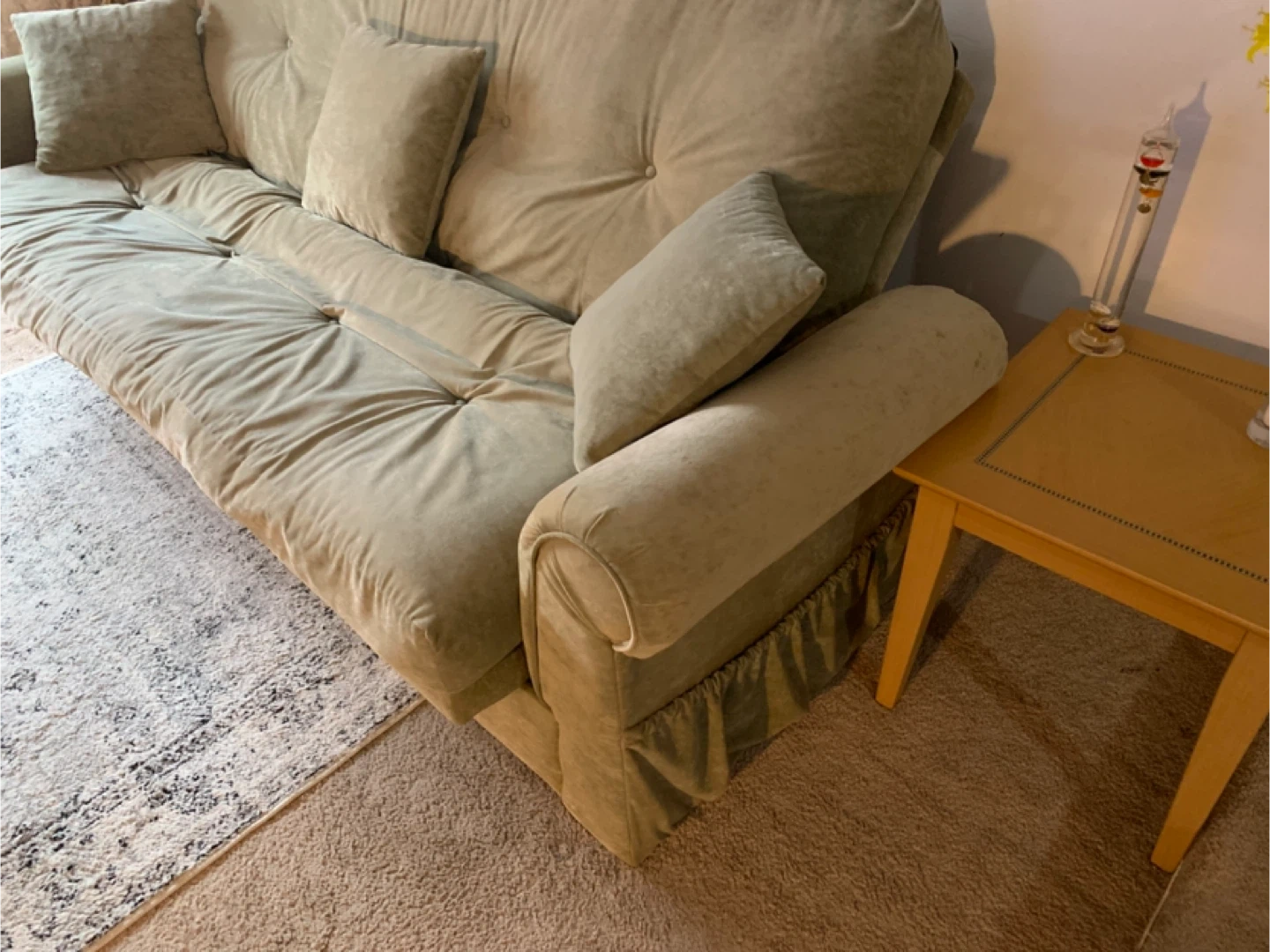Looks more like a couch than a futon but folds out as one and has arms with pockets as pictures show. Comes with cushions In great condition Thick heavy firm mattress Arms do unscrew/come off for easier moving. 92” long Folds out to double size bed Asking $240 Call/text 431-792-3594 Delivery possible