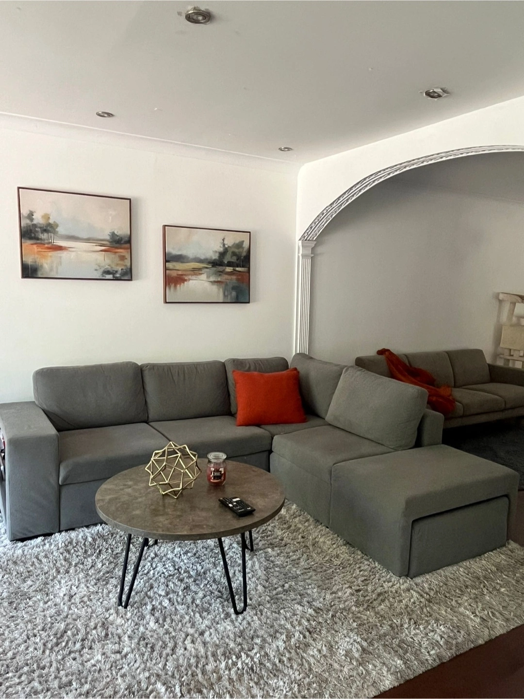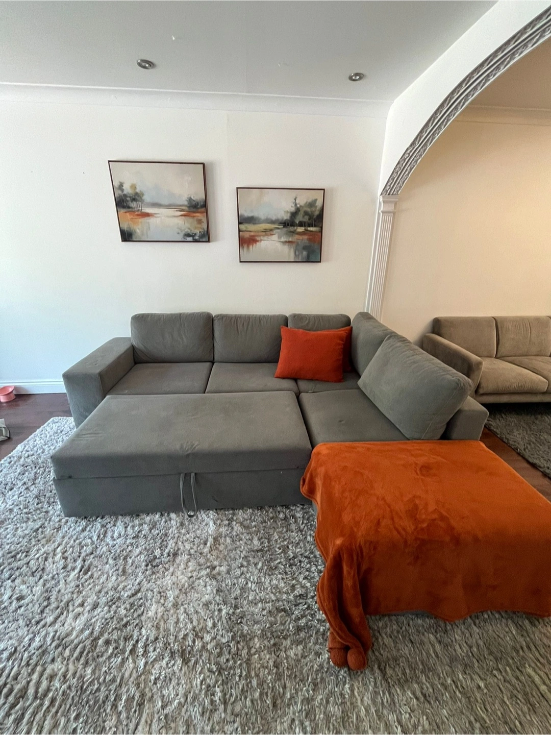 Multifunctional L-shaped sofa bed with storage, upholstered in light gray fabric. Comfortable and spacious, ideal for small or medium living rooms. Includes pull-out bed and built-in storage chaise. One year of use