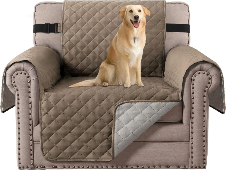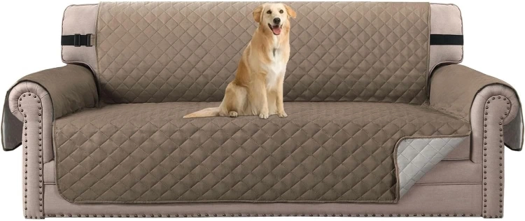 Keep your furniture looking great with this sofa and chair cover set! The covers are a neutral brown colour with a quilted pattern. They have straps to keep them in place, and they're in great condition. 3 Seat Couch Cover and Chair Cover. Couch seat width - 66" Chair seat width - 21" with straps