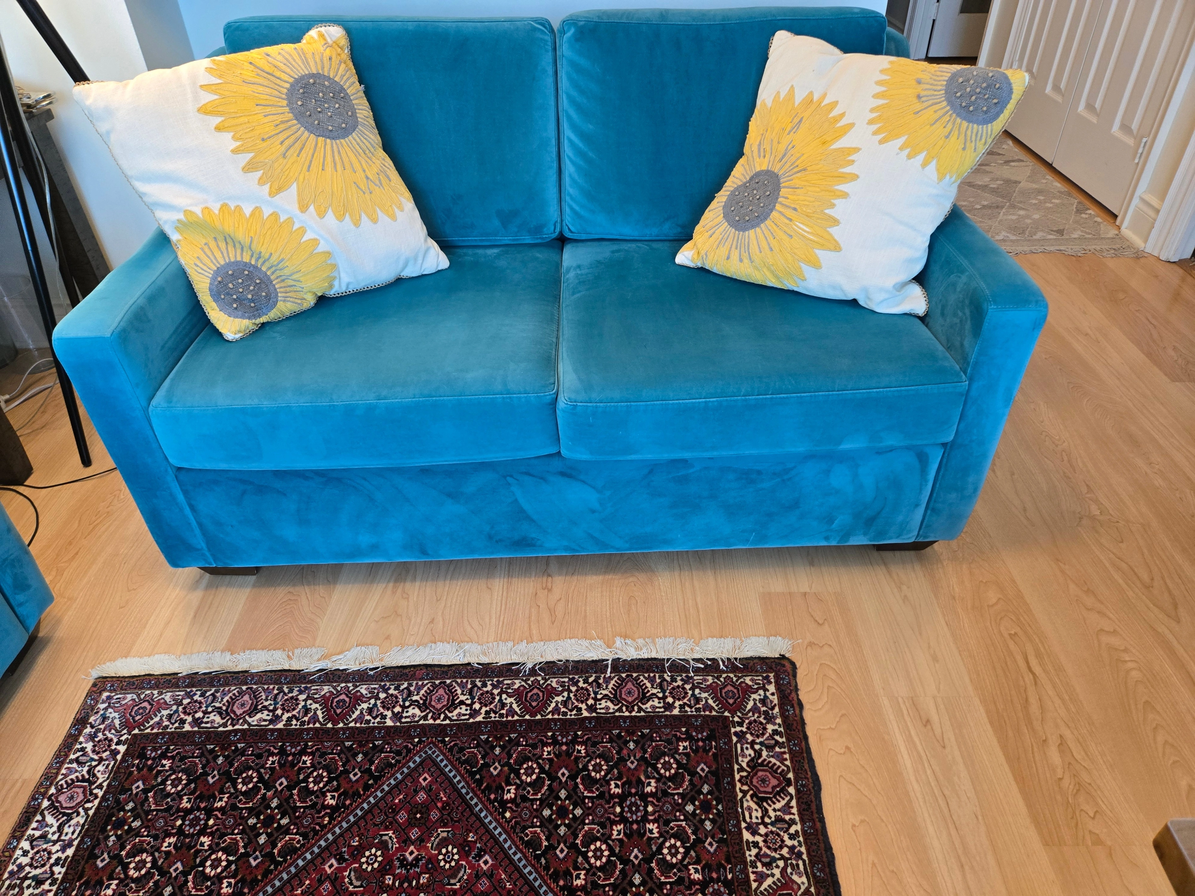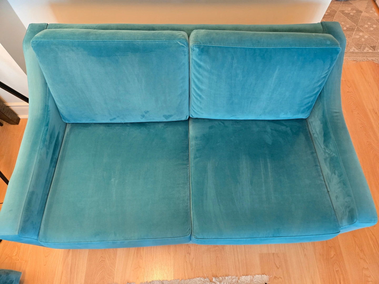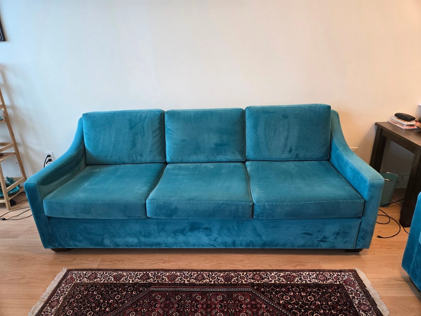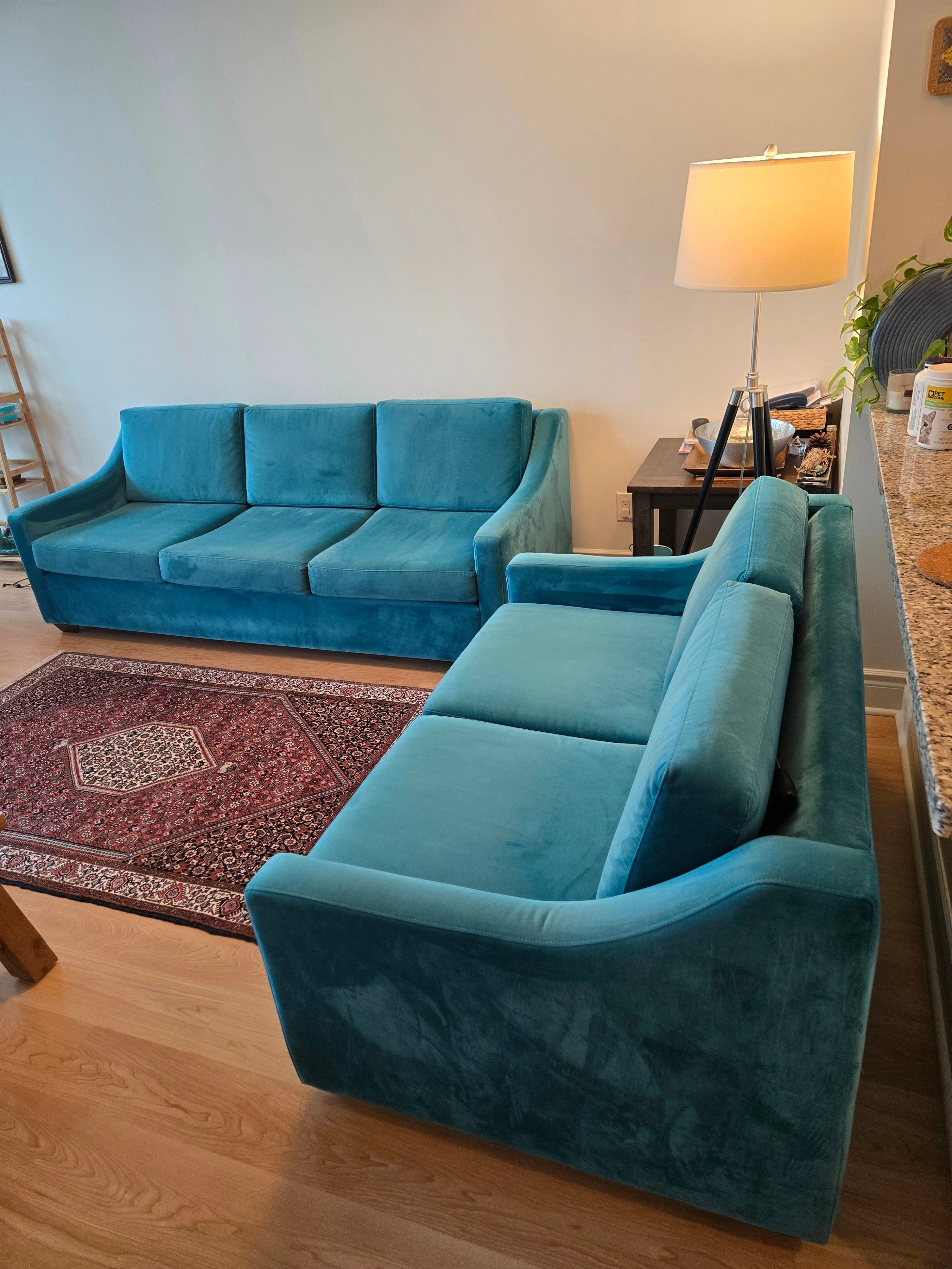 Two beautiful, excellent-condition sofas for sale! This set includes a full-size sofa and a matching loveseat, both in a stunning teal velvet. The color is vibrant, and the fabric is incredibly soft. They're perfect for adding a pop of color to your living room or family room. We've kept them in great shape, with no tears, stains, or damage. They're clean, comfortable, and ready for a new home. We're selling them as a set for $700. Serious inquiries only, please. Pickup is required.