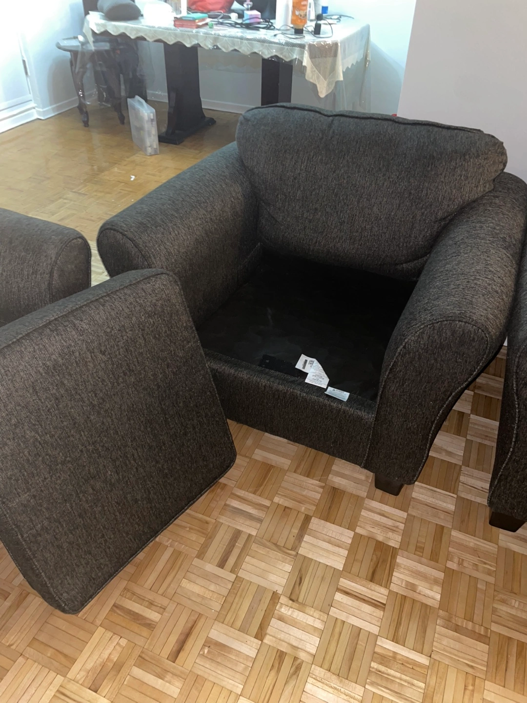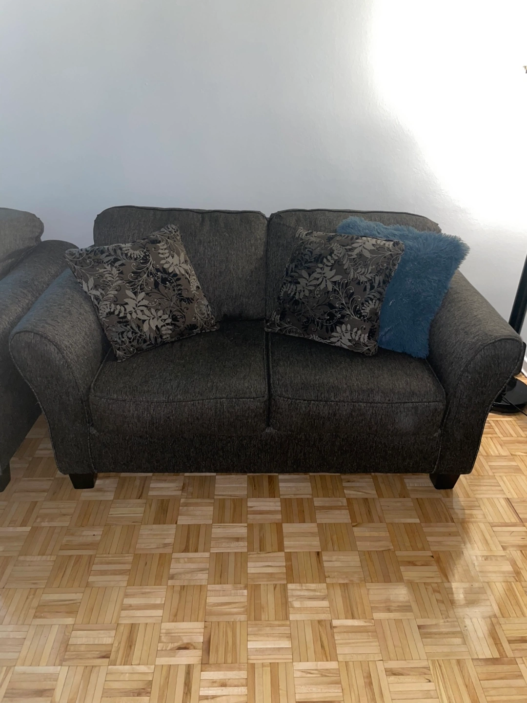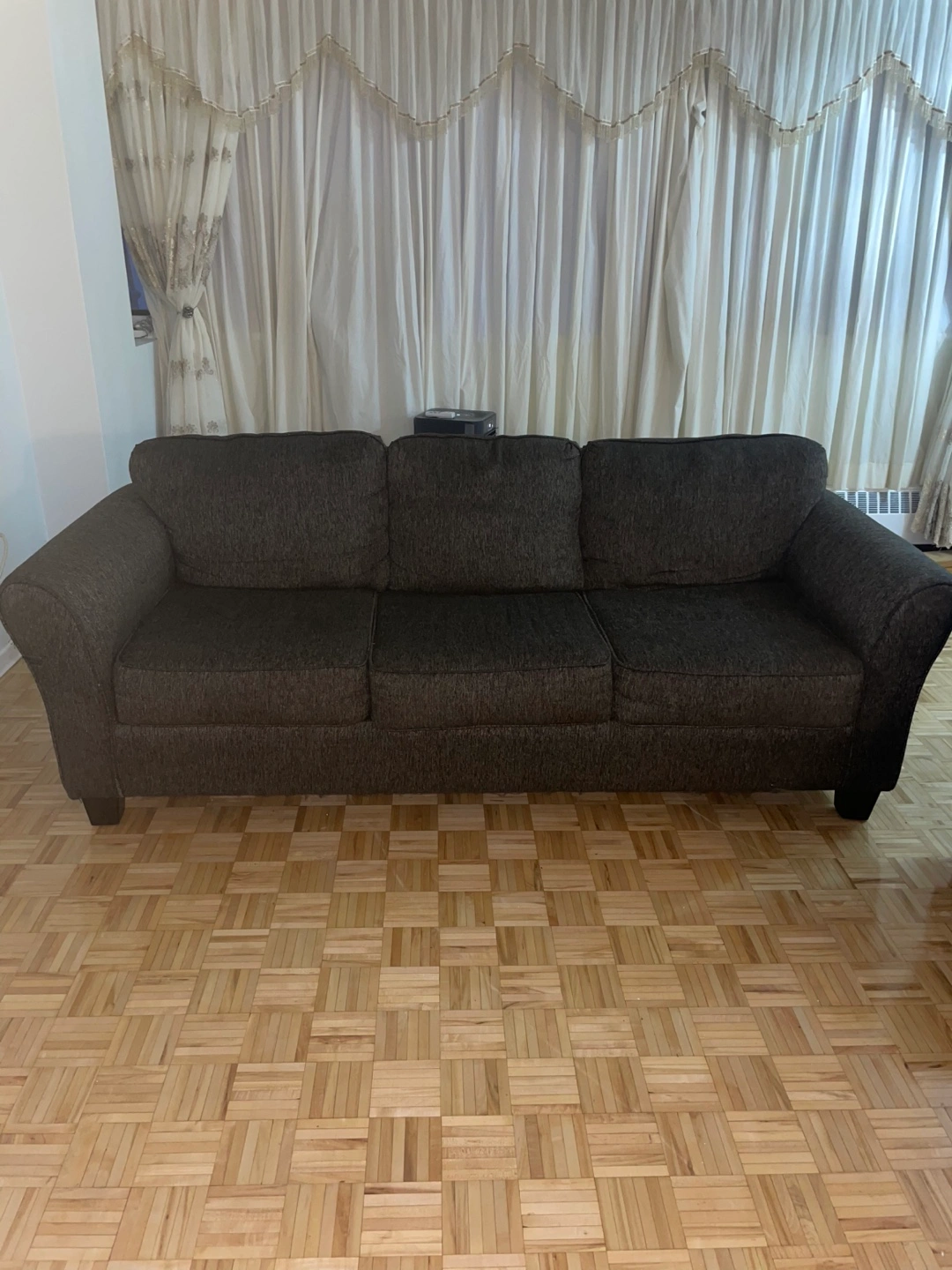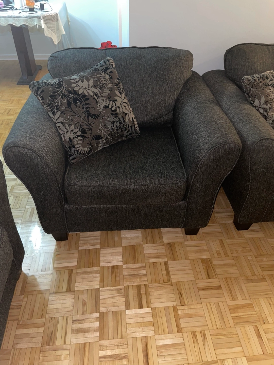Comfy, stylish, and in great condition. This set includes a 3-seater, loveseat, and armchair in a rich dark grey fabric that works with almost any decor. Clean, gently used, and from a smoke-free. Perfect for movie nights or relaxing in style. Ready for pickup in Scarborough.