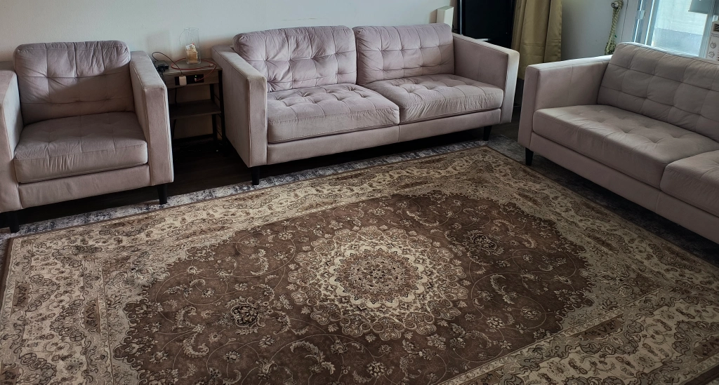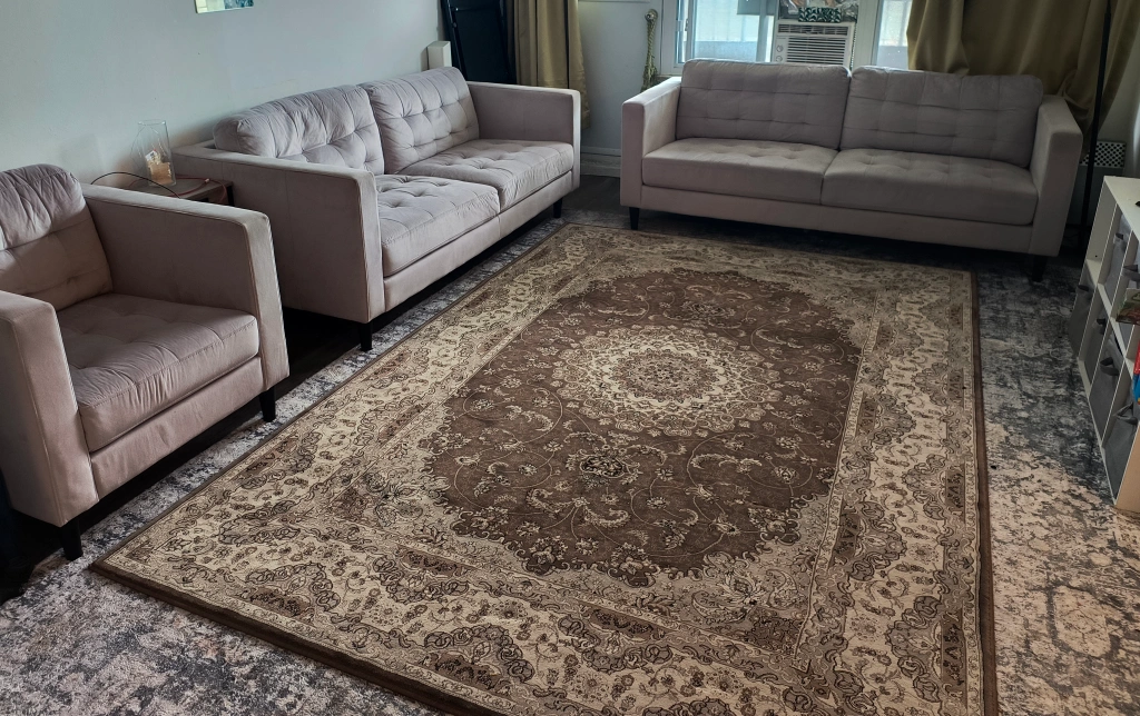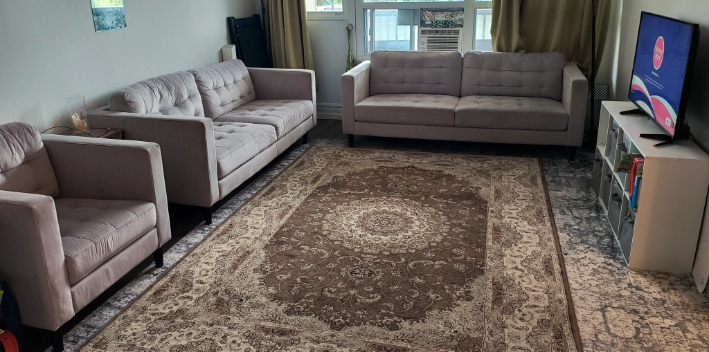 Selling 2 large Leon couches (33.5 × 78 × 32 inches) + one single Leon couch ( 33.5 × 32 ×32) + 6.7× 9.11 ft Turkish carpet (Brown) Pet free, Smoke free, bed bug free and well maintained house. All for 1400 . original prices also posted in the pictures for reference. Price is a little negotiable -no low bowlers please -pickup at Markham and Ellesmere -no holdings -first come first serve