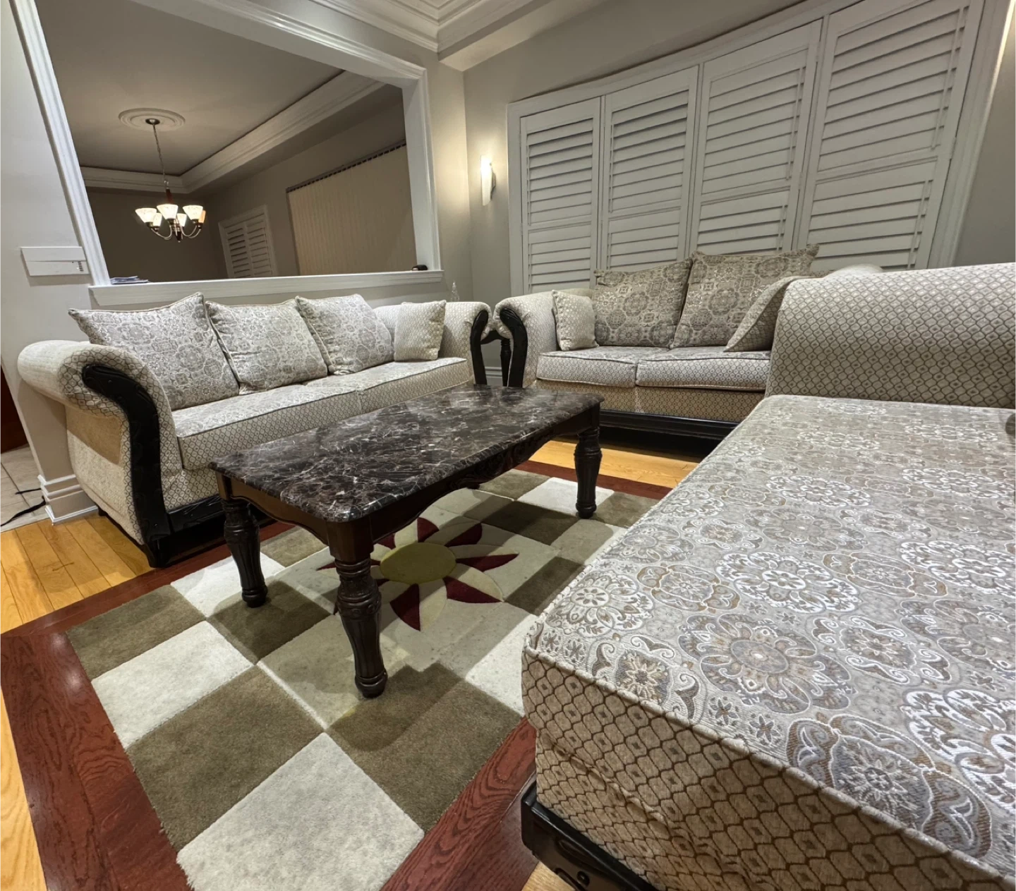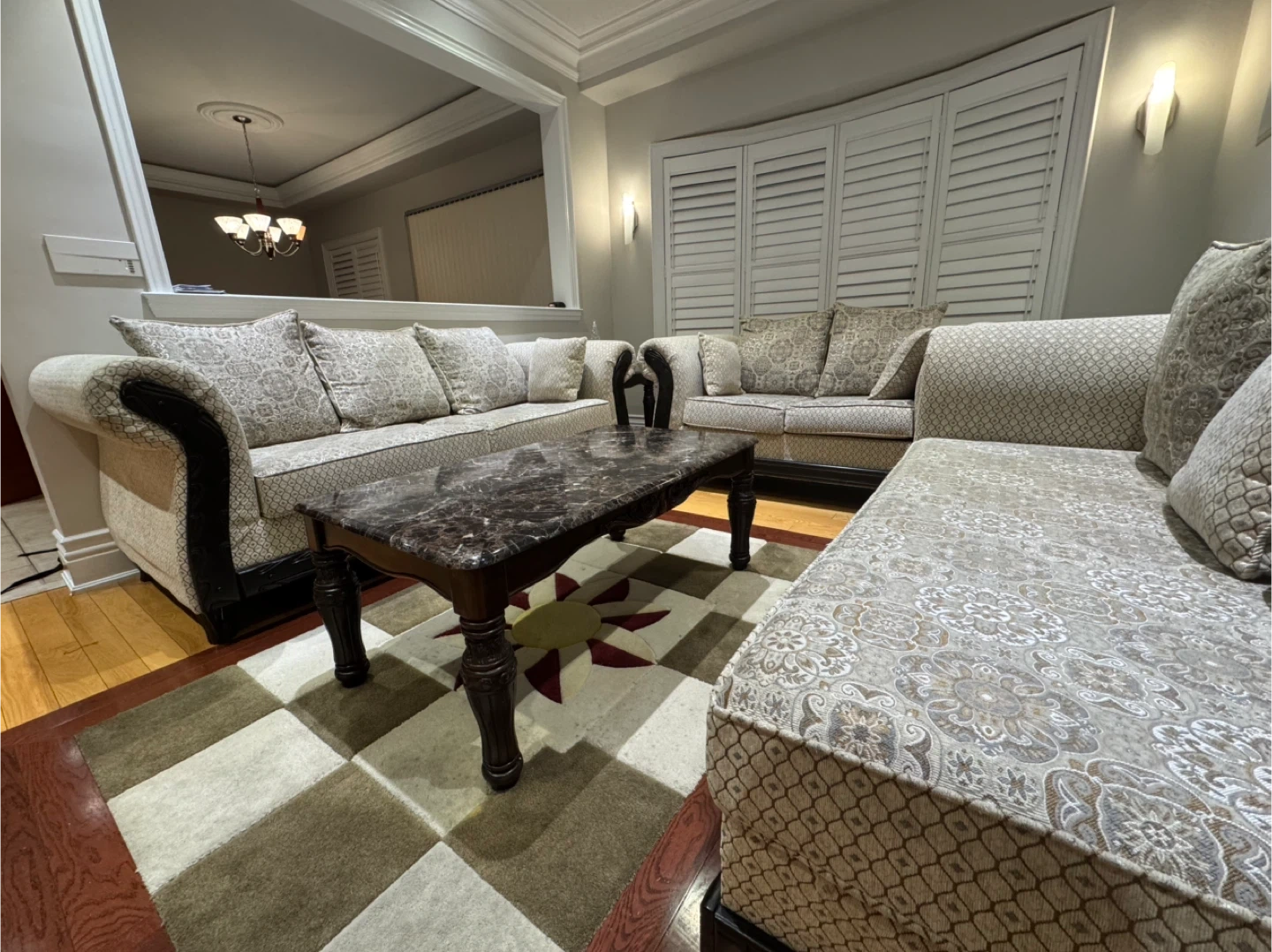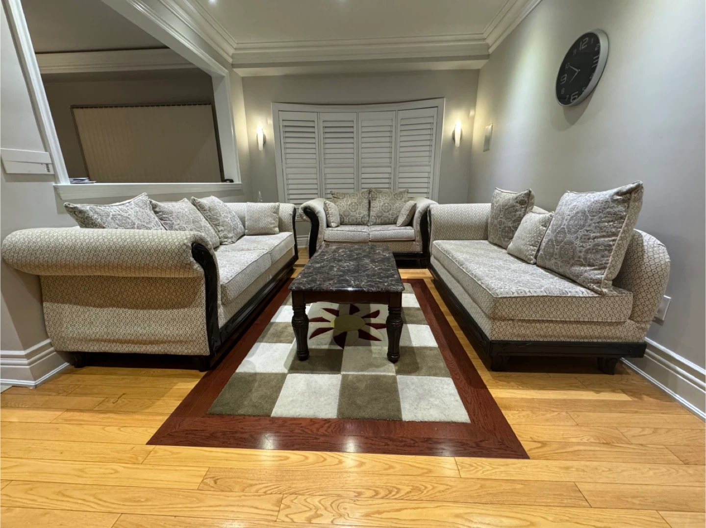 Selling a complete sofa set including couches, a loveseat, and 3 piece coffee table set. The set features a patterned fabric and dark wood trim. It's in great condition and ready to add some comfort to your living space!