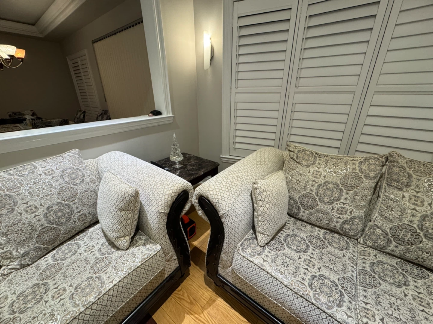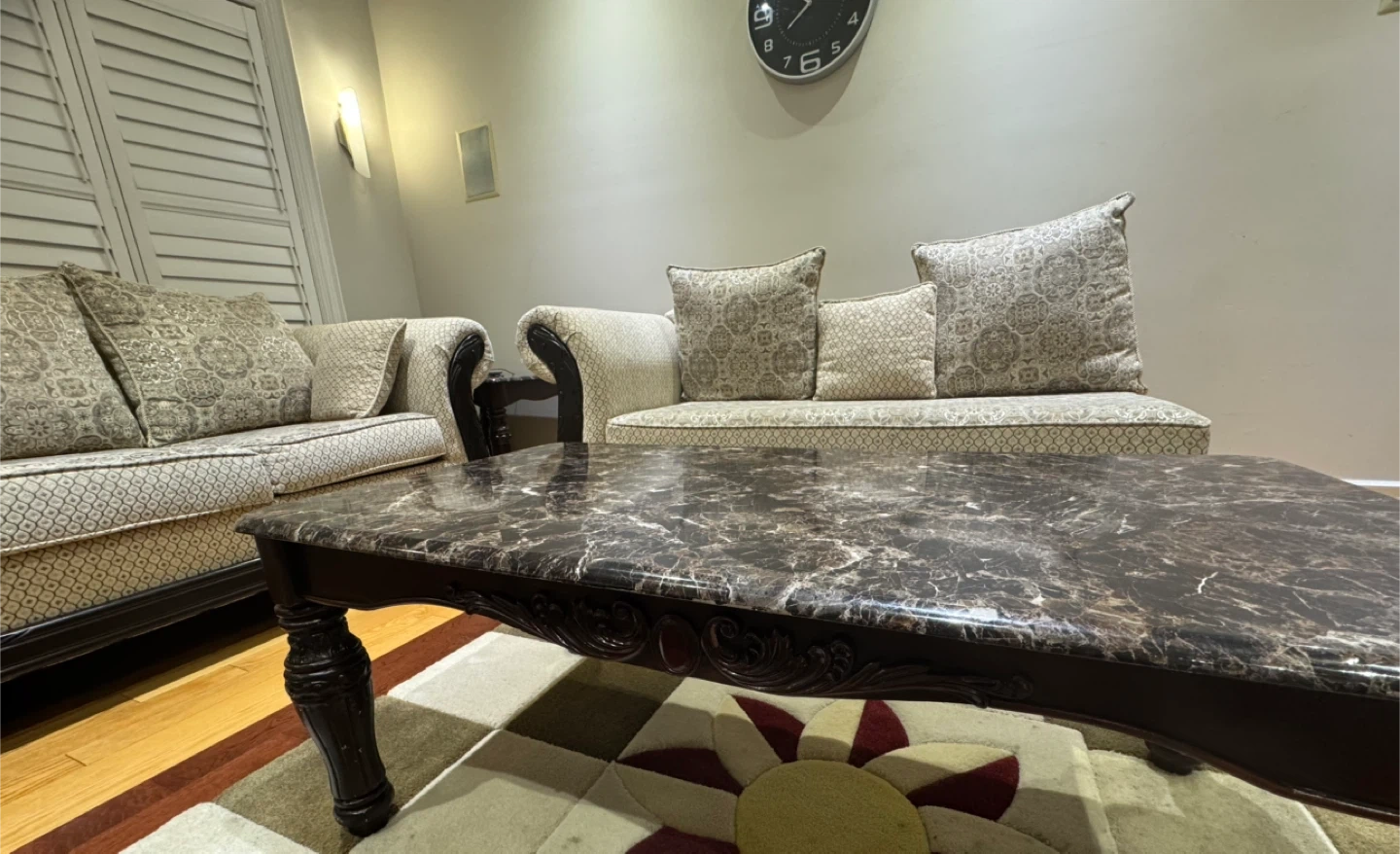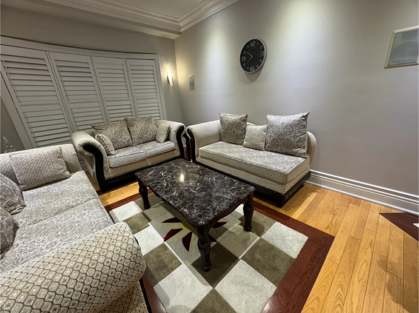 Selling a complete sofa set including couches, a loveseat, and 3 piece coffee table set. The set features a patterned fabric and dark wood trim. It's in great condition and ready to add some comfort to your living space!