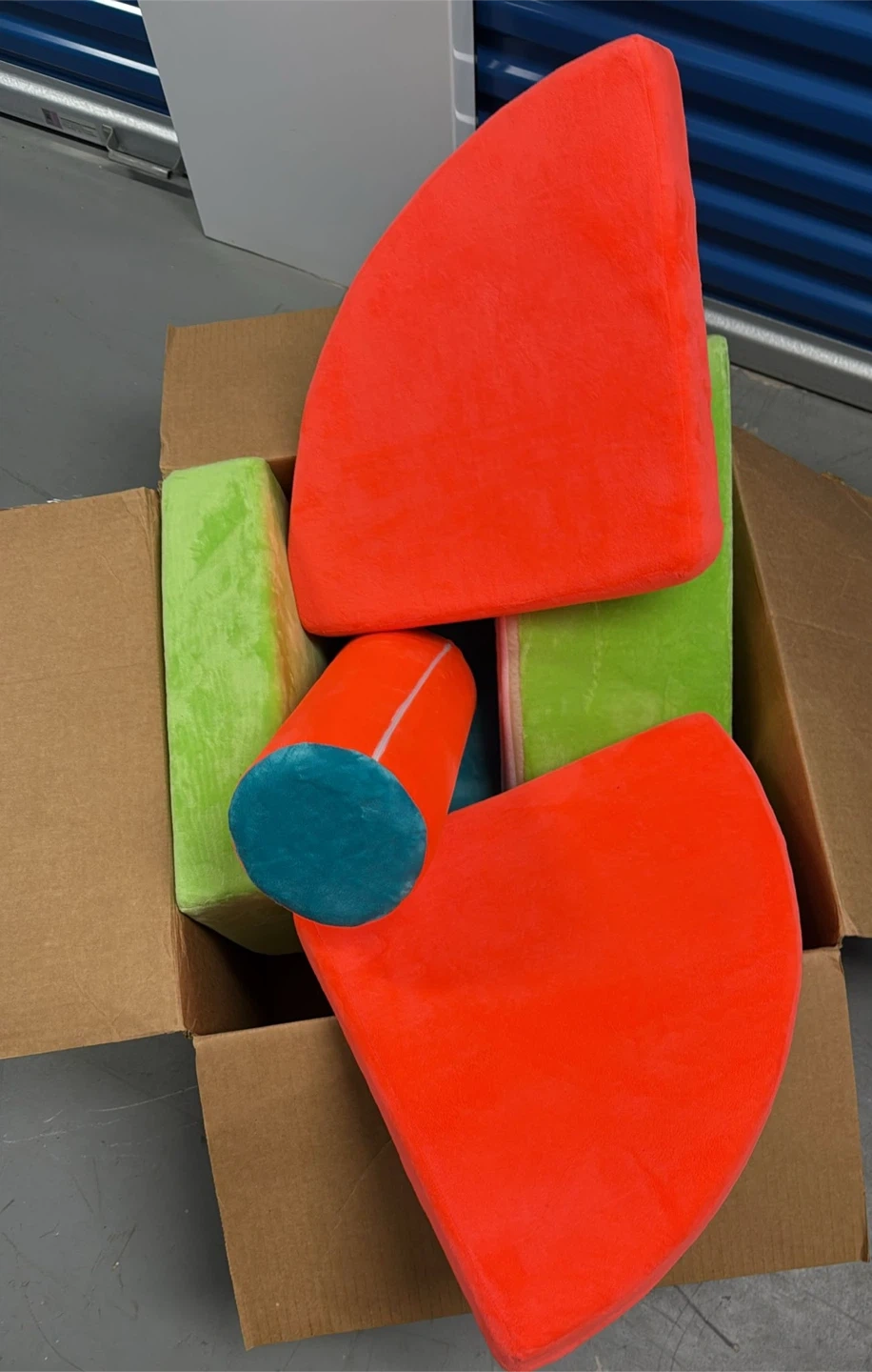 Selling a fun soft play set! Includes various shapes in bright red, green, and blue. Perfect for kids to play and explore with. Comes in a box for easy storage and transport! New open box