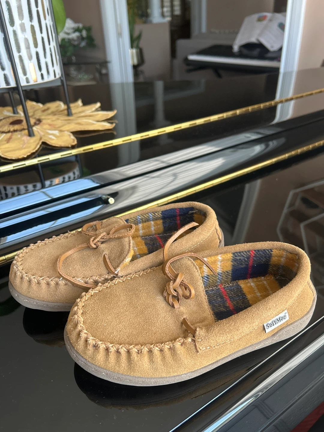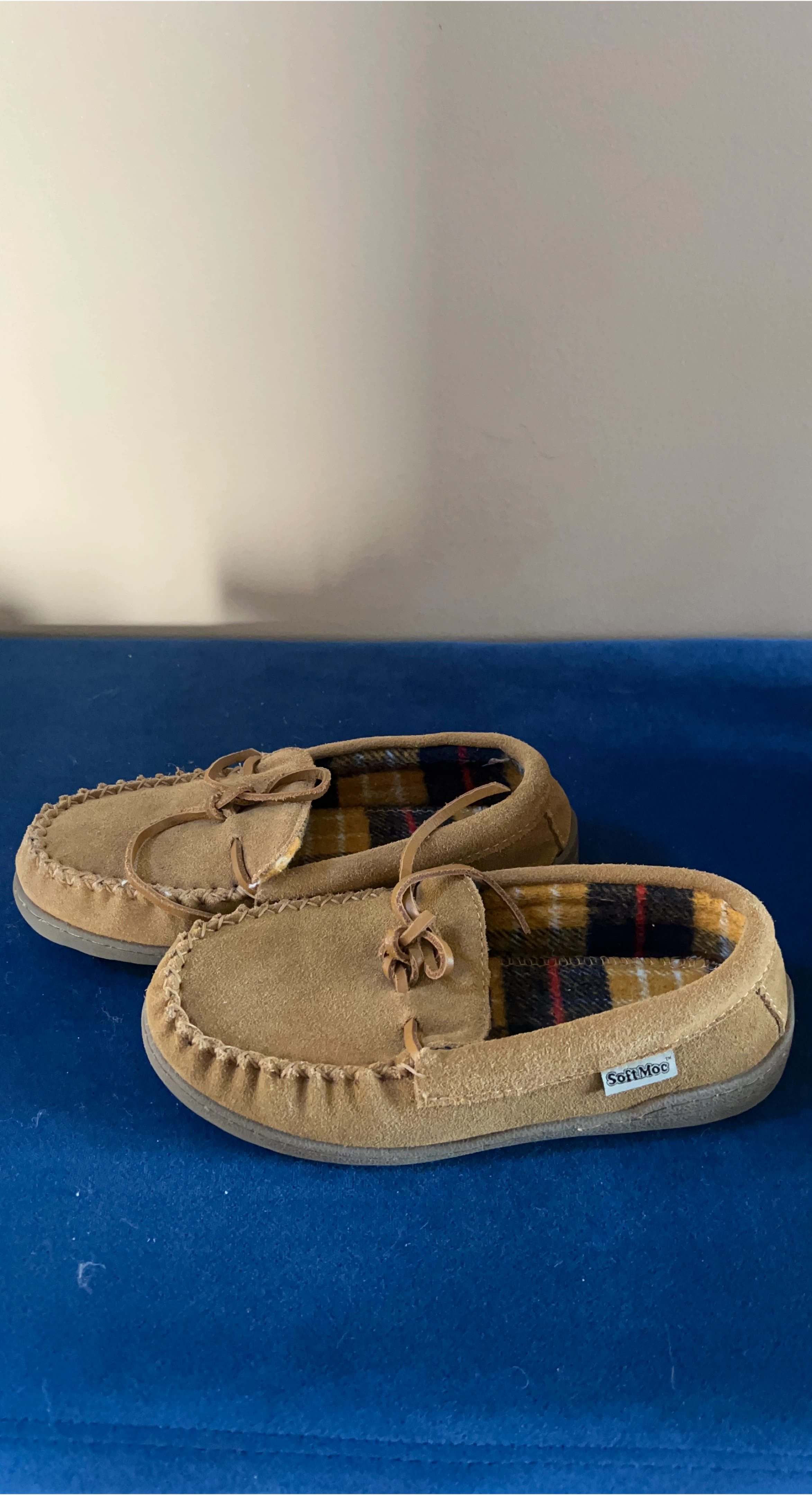 Size 2M (only used once during modelling)- Cozy SoftMoc moccasin slippers, perfect for keeping your feet warm around the house! They're a soft suede material with a plaid lining. In great condition and ready for a new home!