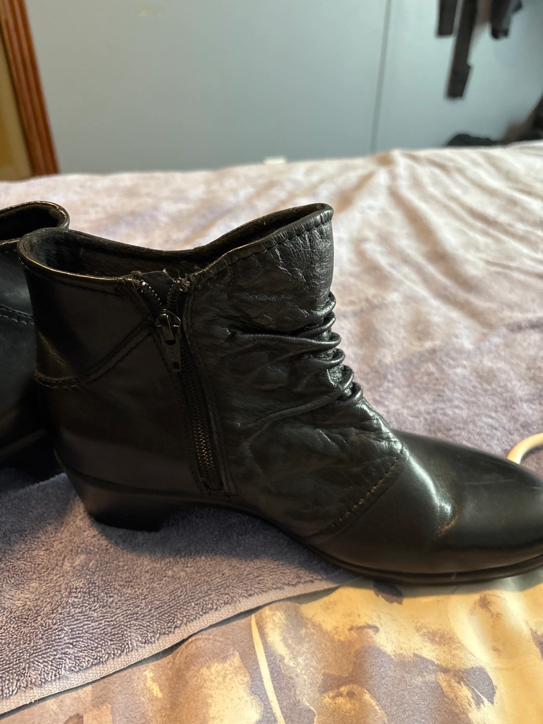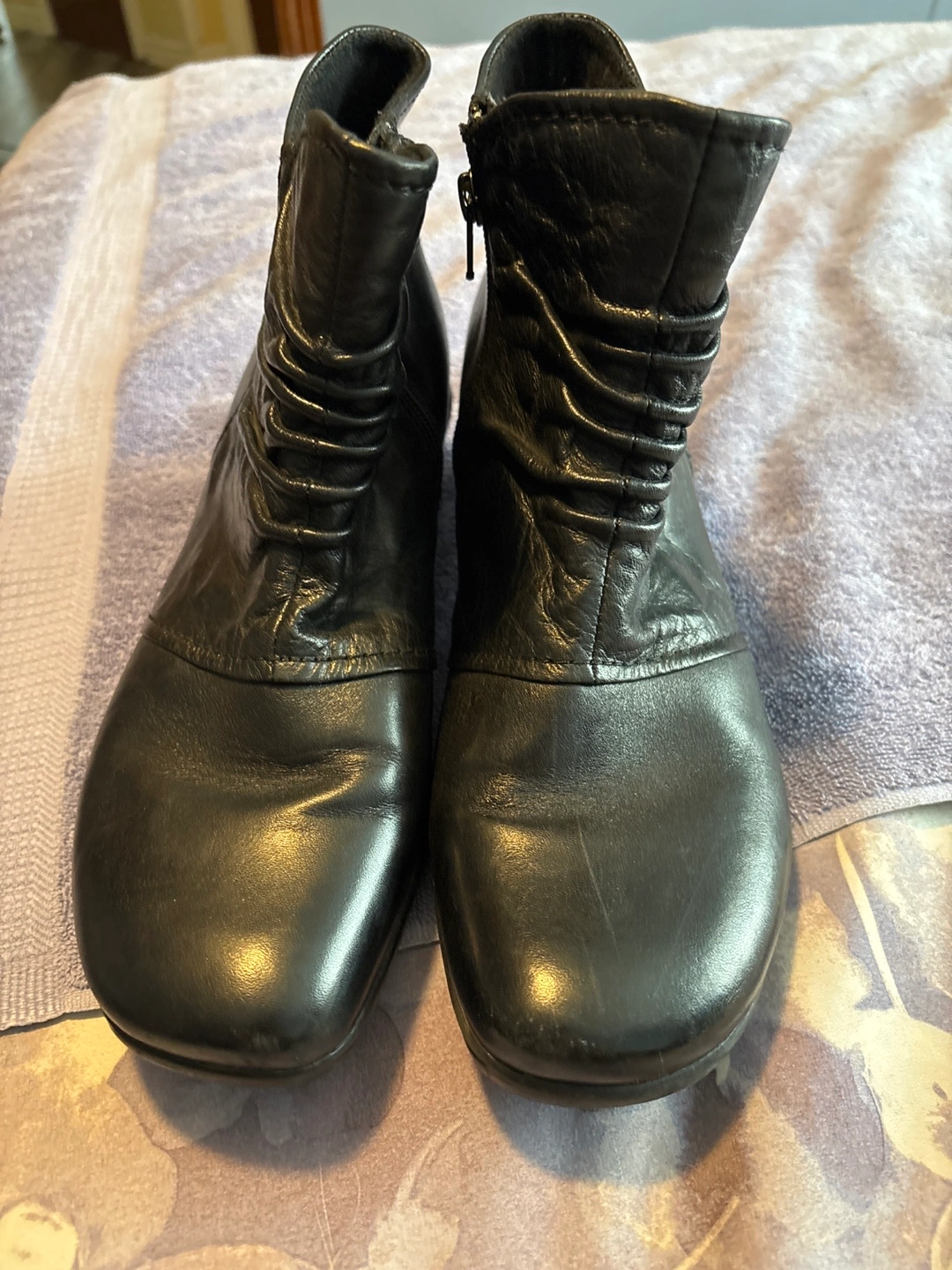 Show allPair of black leather ankle boots. Side zipper closure. Slightly gathered detailing at the ankle. Low heel.