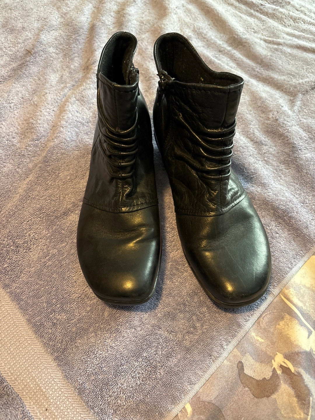 Pair of black leather ankle boots. Side zipper closure. Slightly gathered detailing at the ankle. Low heel.