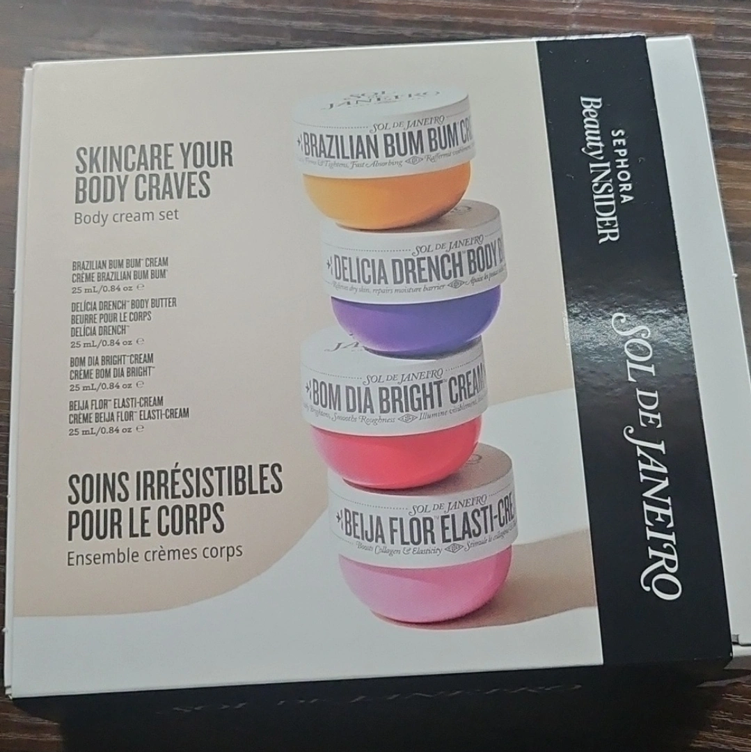 Selling a Sol de Janeiro body cream set. This set includes four mini body creams: Brazilian Bum Bum Cream, Delicia Drench Body Butter, Bom Dia Bright Cream, and Beija Flor Elasti-Cream. Each cream is 25 mL/0.84 oz. Perfect for trying out different scents and formulas!
