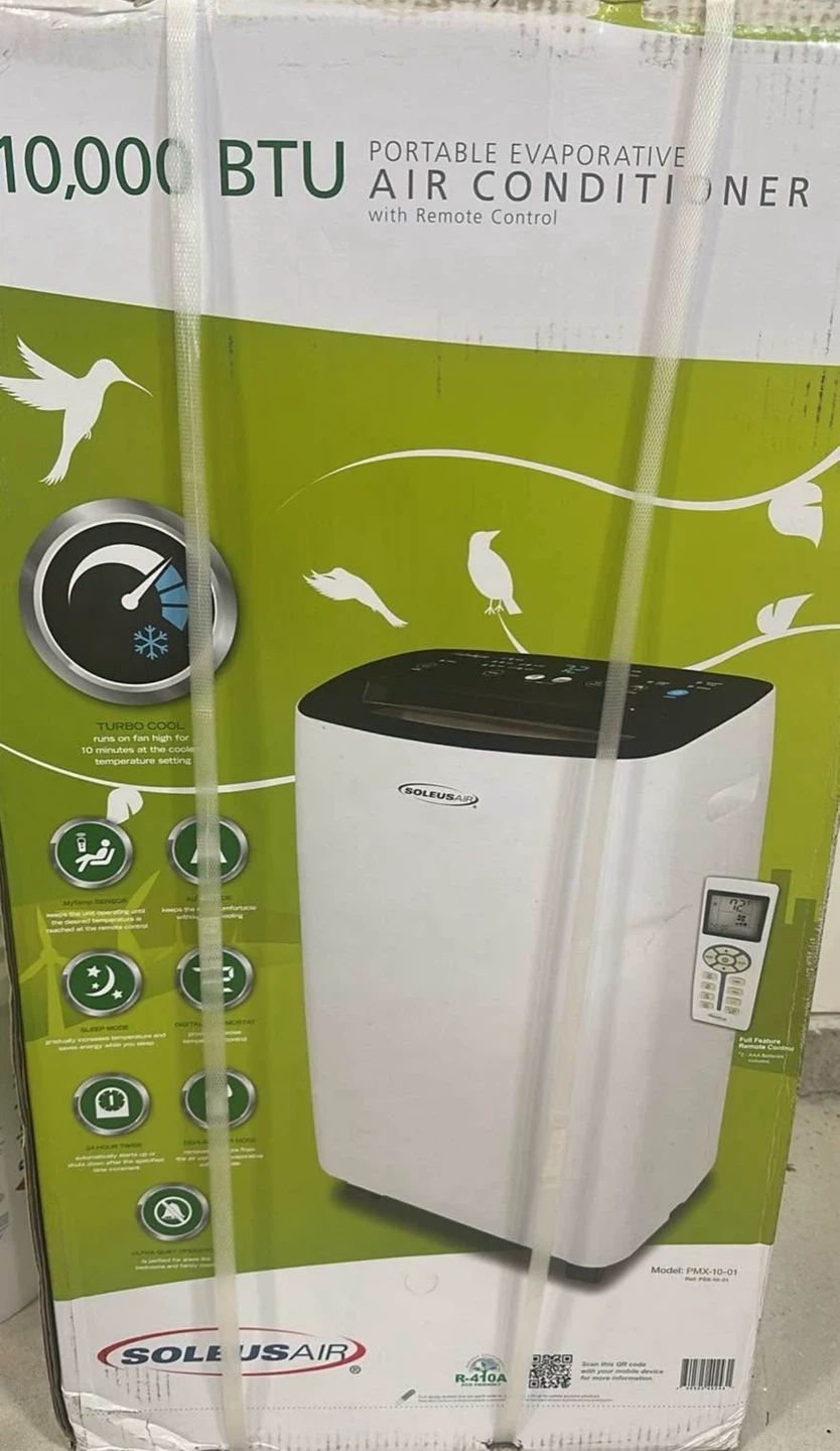 Selling a SoleusAir portable evaporative air conditioner with remote control. It's a 10,000 BTU unit, perfect for cooling down a room quickly. Features include Turbo Cool, which runs the fan high for 10 minutes at the coolest temperature setting. Also has a remote control for easy operation!