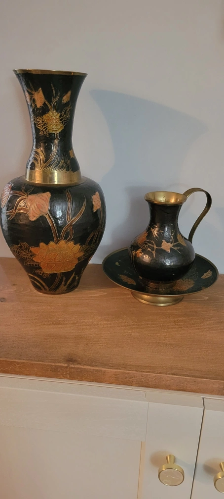 Selling a beautiful solid brass vase and pitcher set. They are handmade in India and feature intricate floral designs. Perfect for adding a touch of elegance to your home decor!