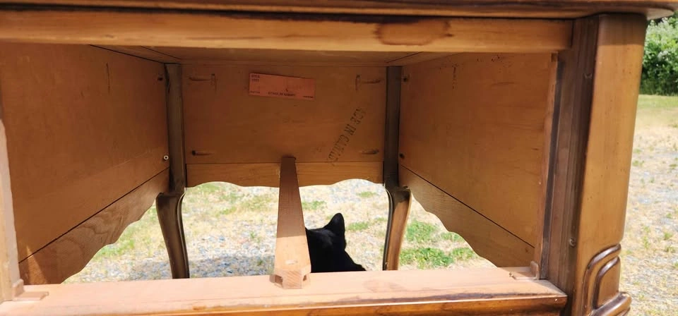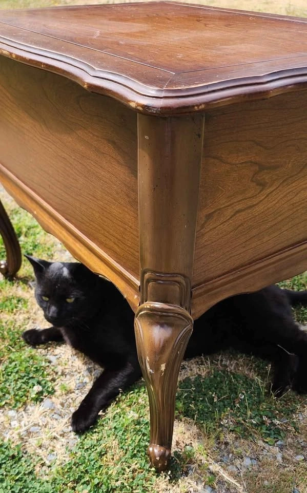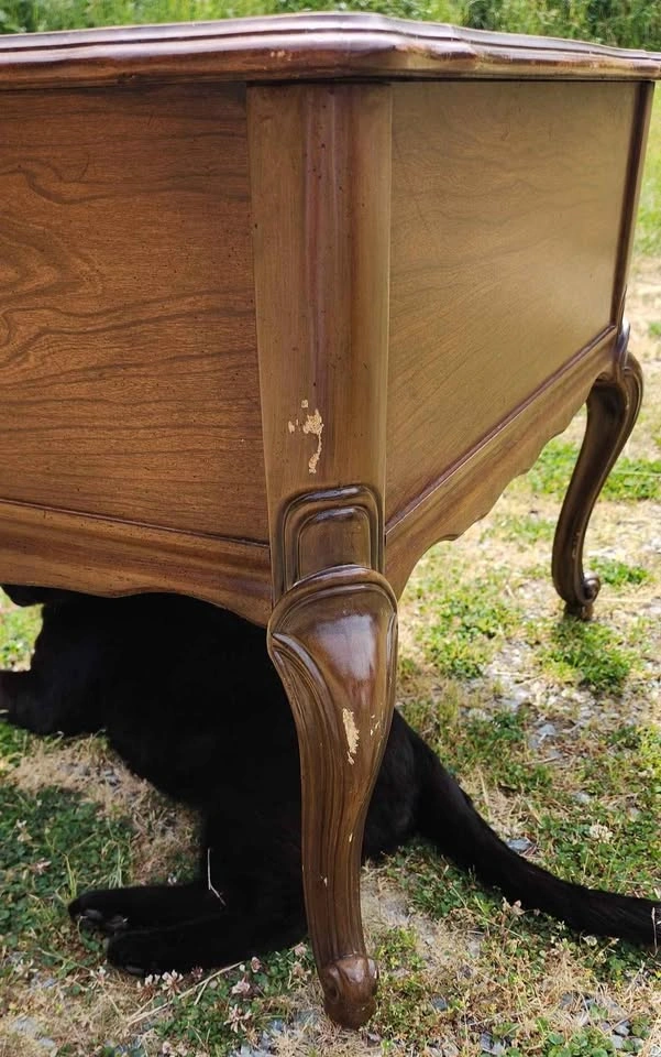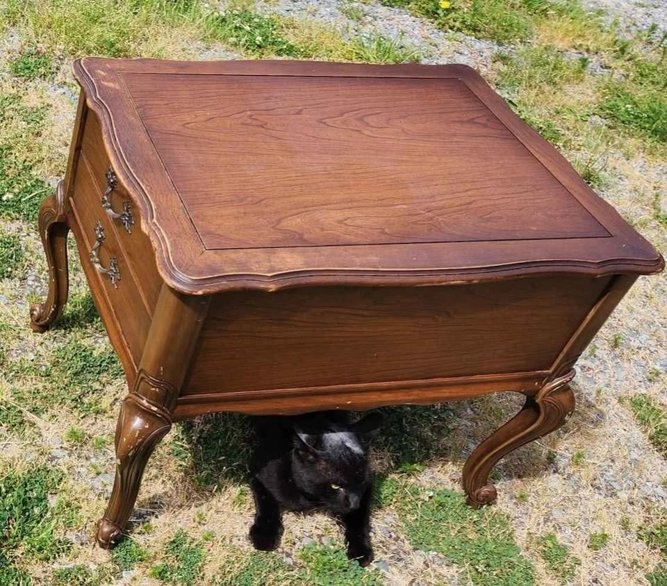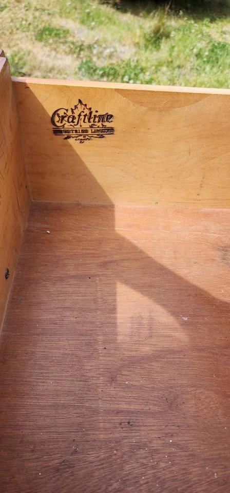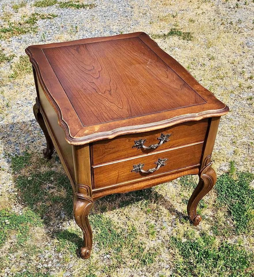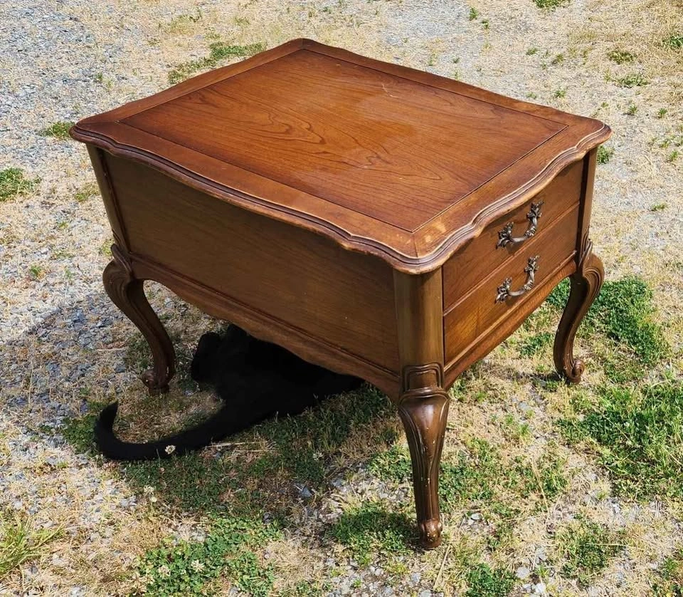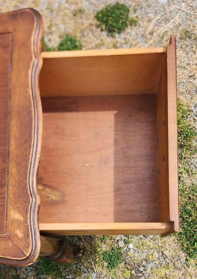 End Table by CraftLine Solid fruit wood with single deep drawer on a wood track with plastic runner in great condition. Made in Canada in 1971 by CraftLine Industries Limited Stain color is Bordeaux Reproduction of a Louis XV end table, Cabriole legs, ornate scrolled aprons and edges and ornate brass handles. Fresh out of storage at the farm. Has a couple of scratches on the legs and some scribbles on the top surface, could use a bit of love. Has many years of life left in it. Pickup in Shawnigan Lake or; Cash or E-transfer accepted.