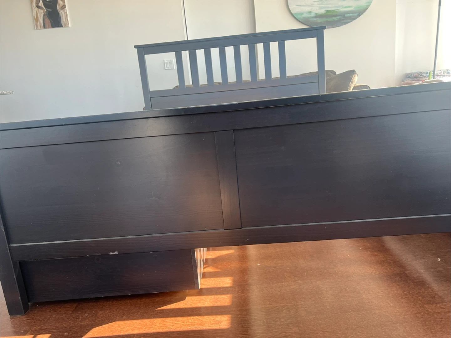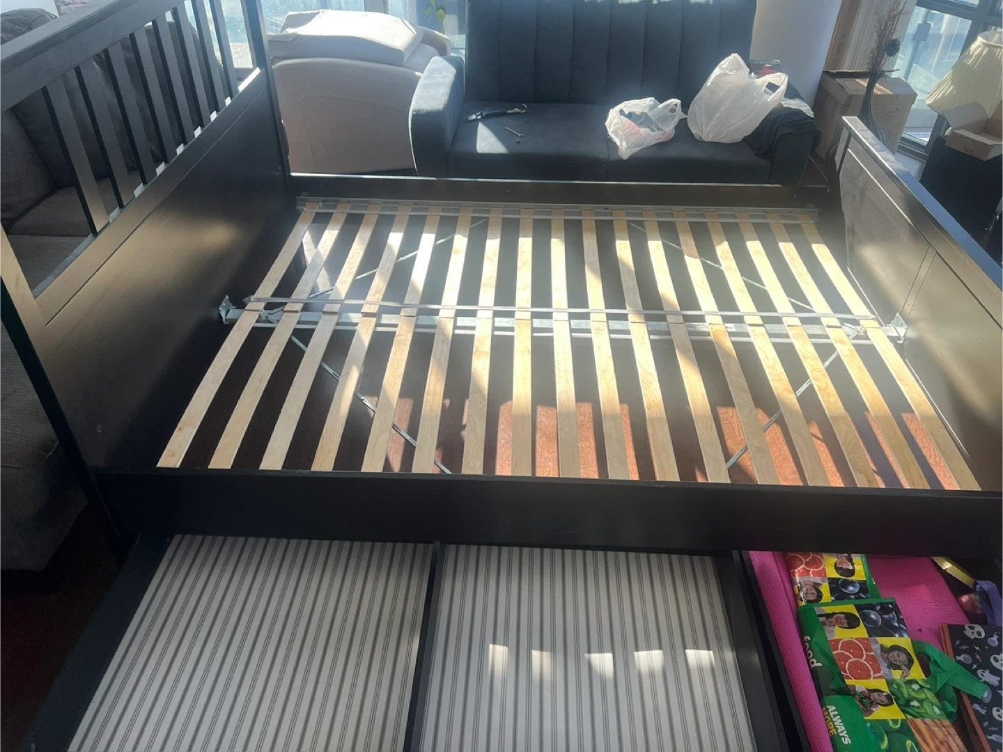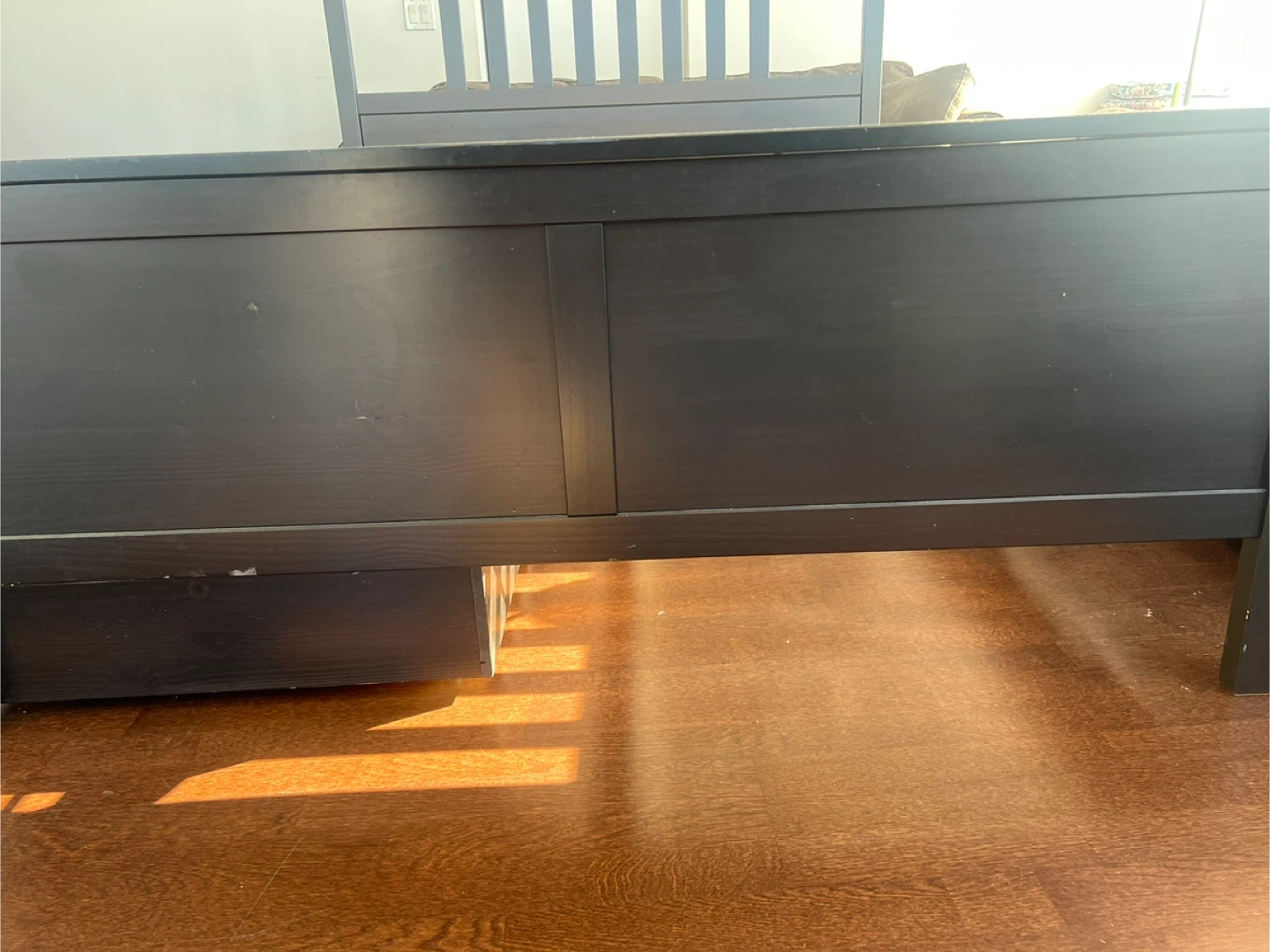 This beautiful dark brown bed frame is made of solid wood and would be a great centerpiece for your bedroom. It also includes storage drawers underneath the bed, perfect for storing bedding, pillowcases. Along with this is a mattress which sits perfectly on it and is in very good condition sizing 16 inches . Need to sell ASAP . Pick up at Bay and College station. Downtown, Toronto M5S1Z6