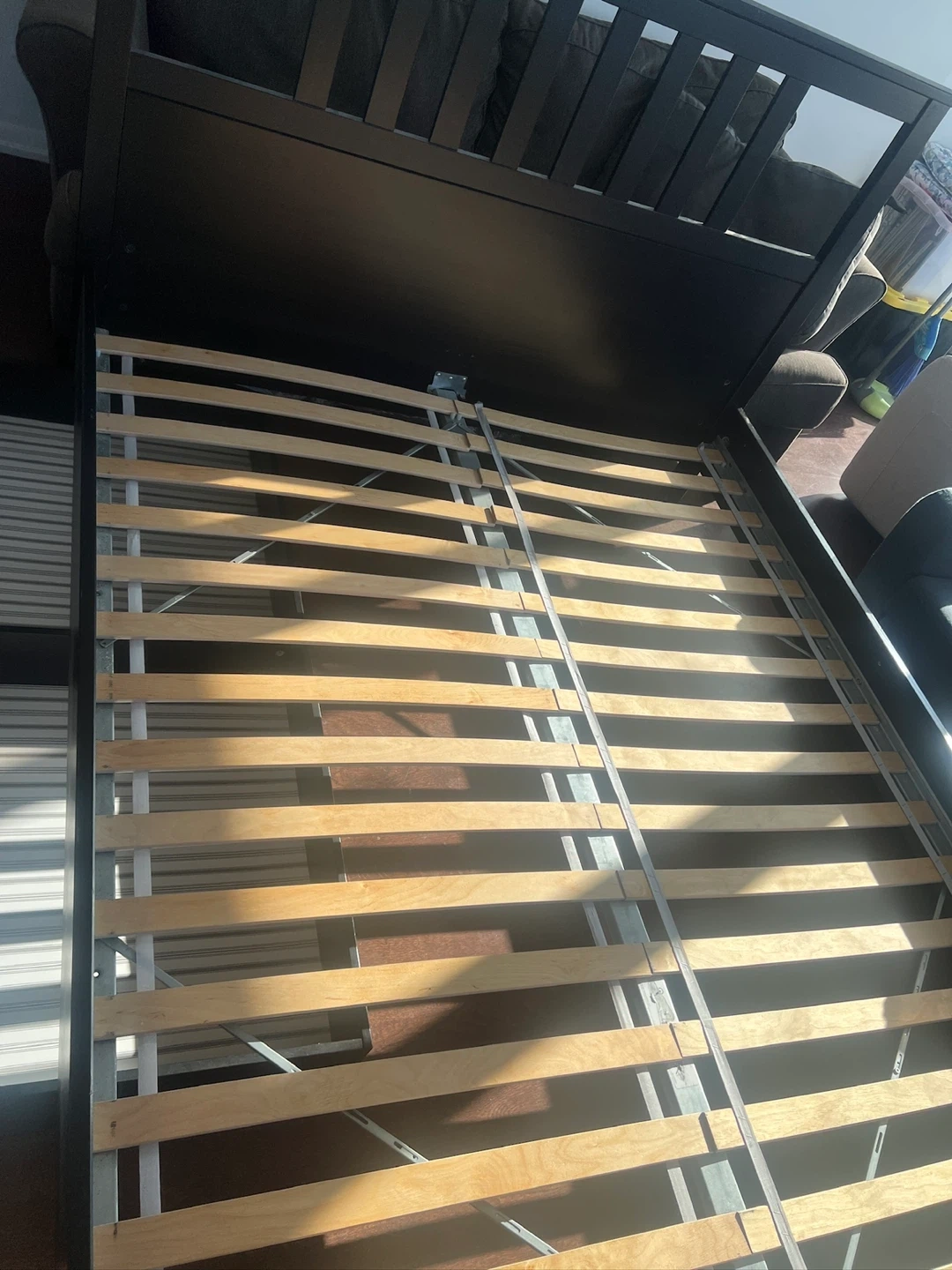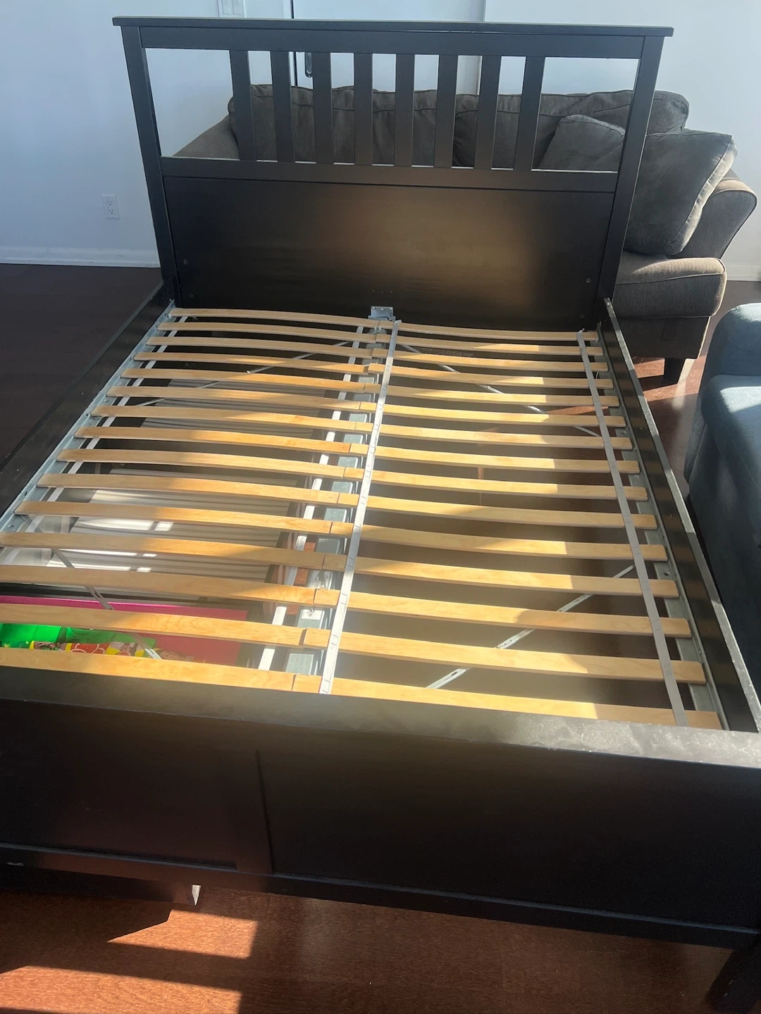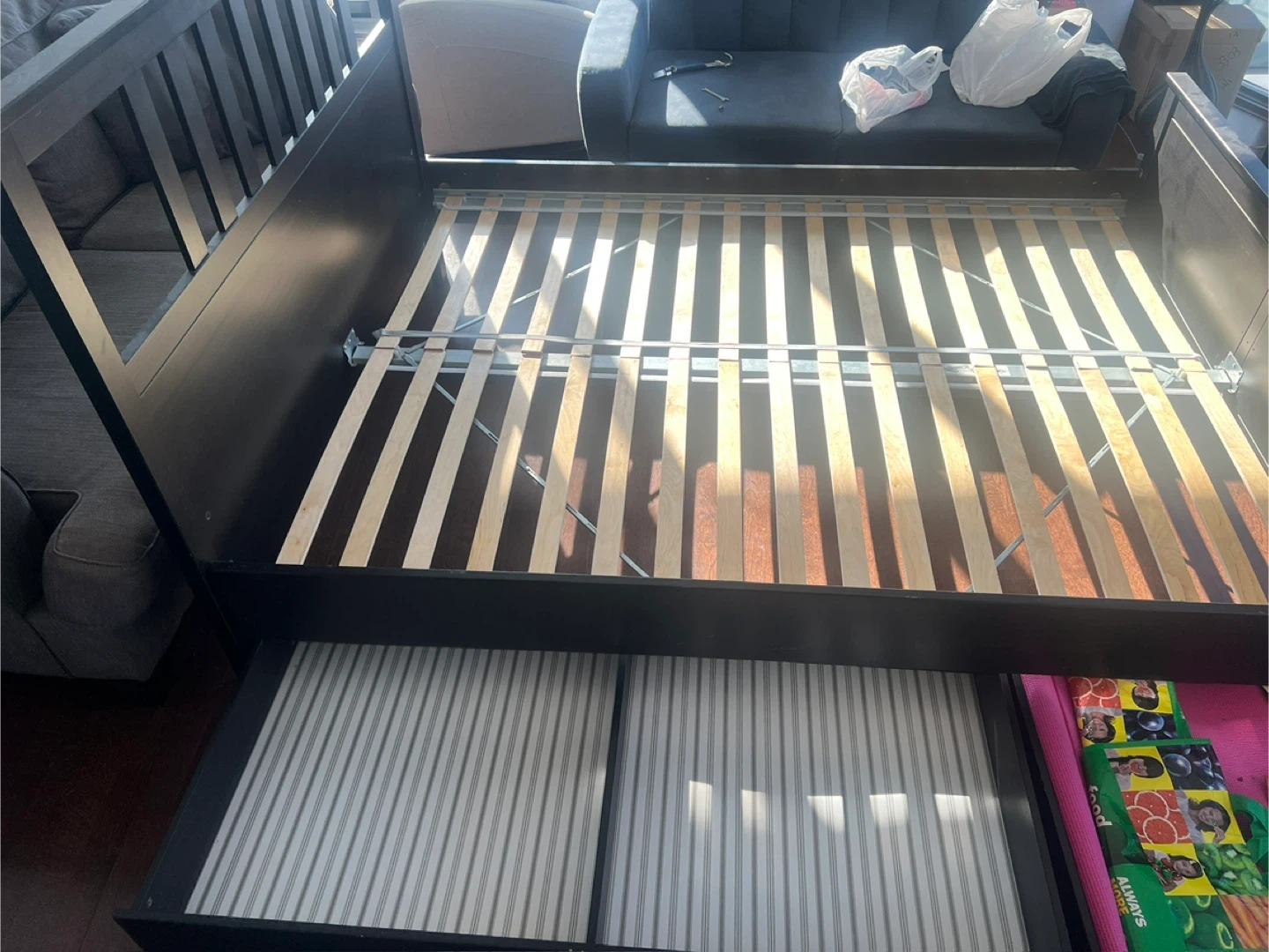 This beautiful dark brown bed frame is made of solid wood and would be a great centerpiece for your bedroom. It also includes storage drawers underneath the bed, perfect for storing bedding, pillowcases. Along with this is a mattress which sits perfectly on it and is in very good condition sizing 16 inches . Need to sell ASAP . Pick up at Bay and College station. Downtown, Toronto M5S1Z6
