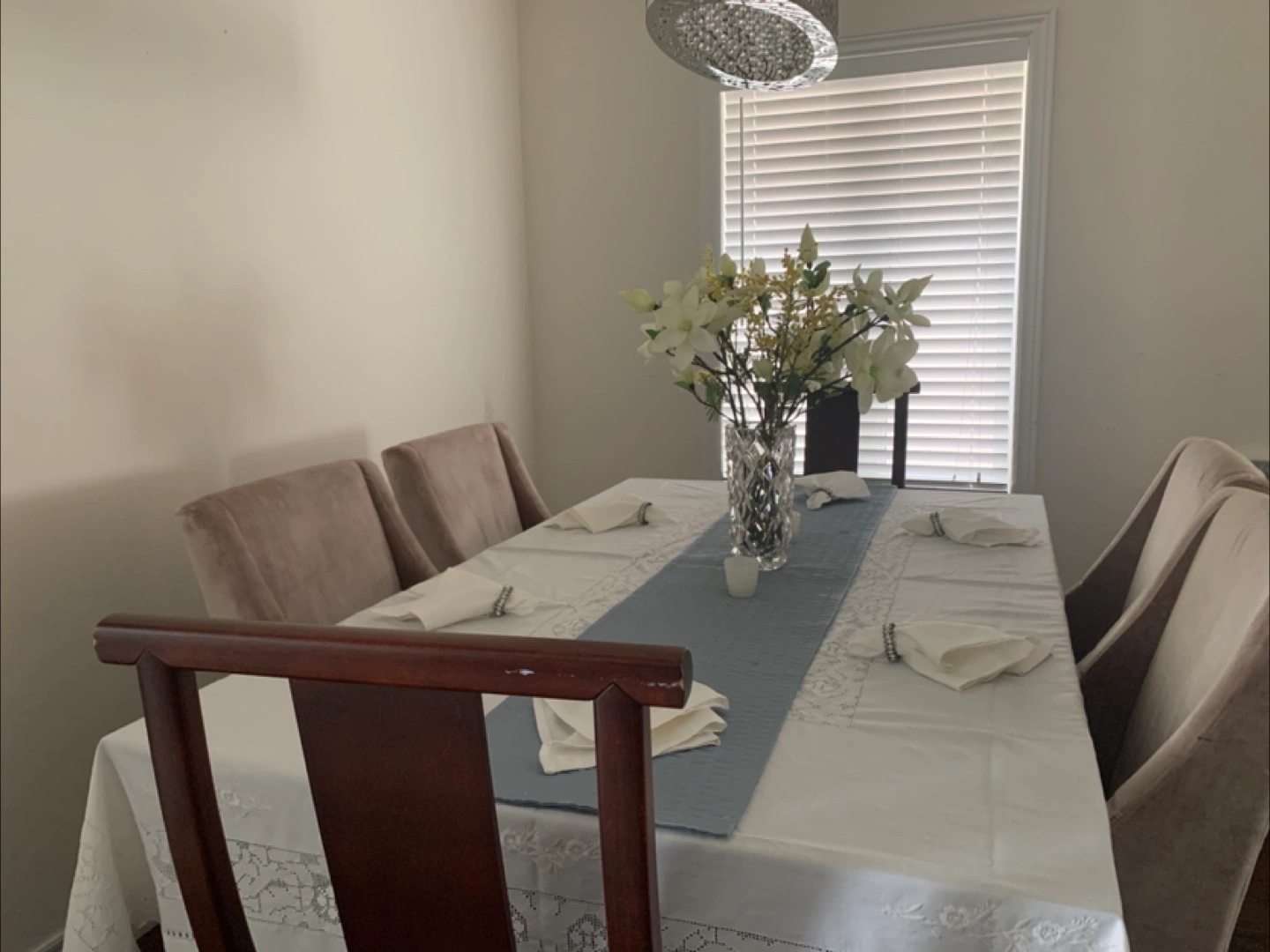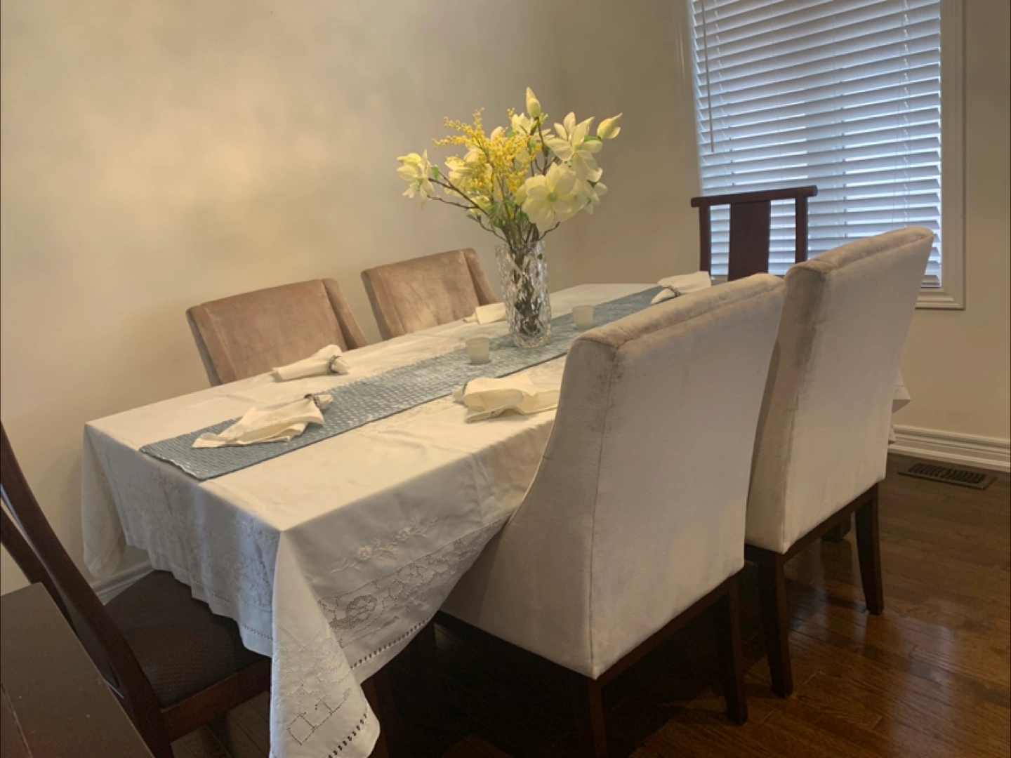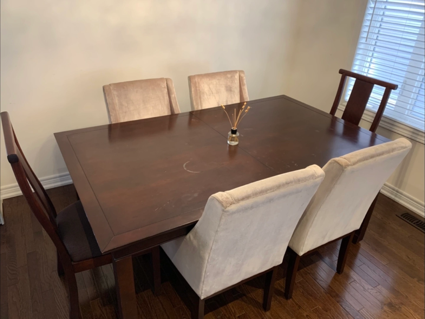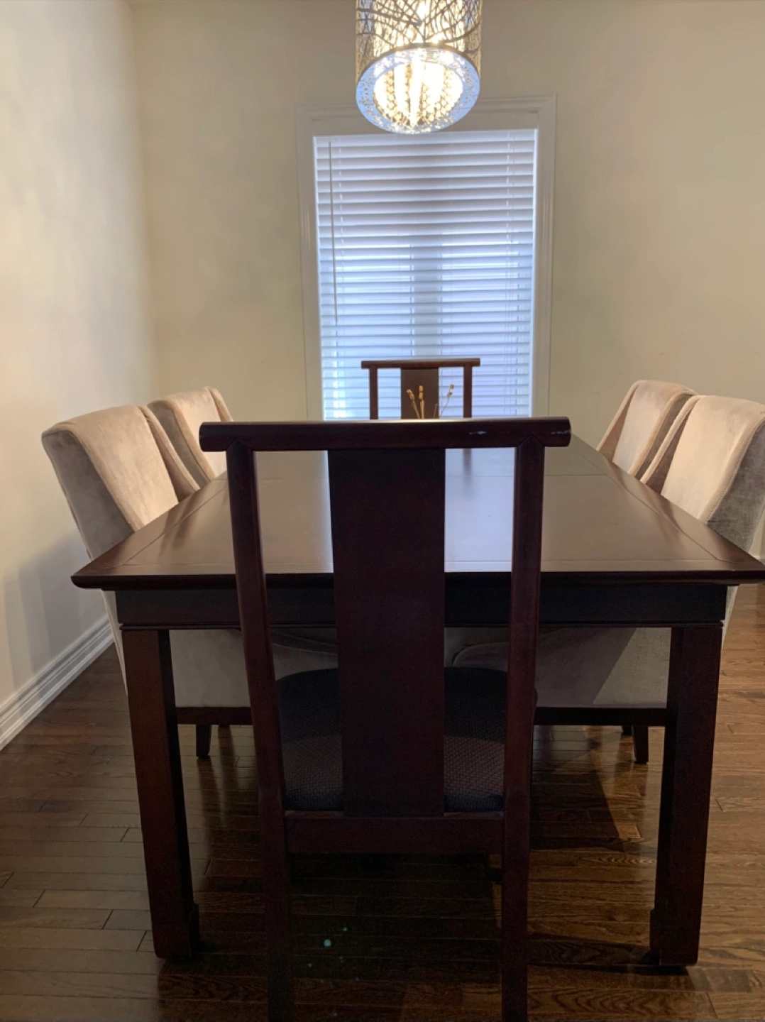 Selling a dining table with 8 chairs. The table is dark solid wood with extendable leaflet to seat 8 people. It's a great set for family dinners or hosting friends. $200 for table, $600 with 8 chairs.